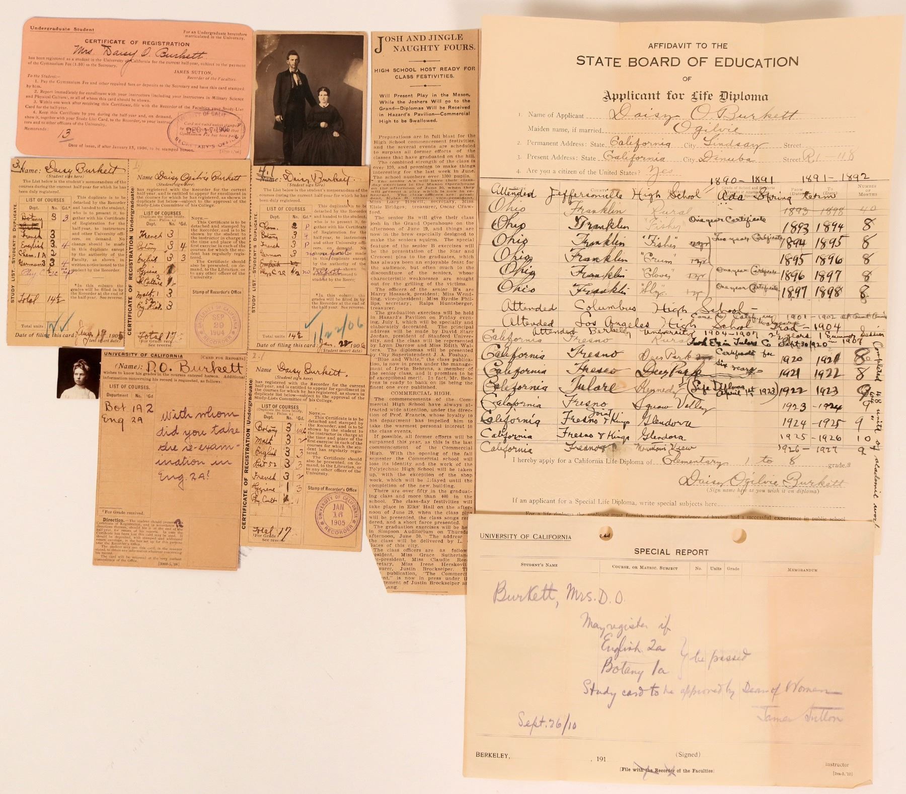 Lot of 11 pieces. Mini archive for Daisy O. Burkett, a Fresno County teacher who was educated at UC Berkeley c.1905-1912. Includes 6 university registration cards; a CDV of her parents; a report card; an Affidavit to the State Board of Education of Applicant for Life Diploma to teach grades 1-8 (lists her entire educational and professional background); and a newspaper clipping about a high school graduation.