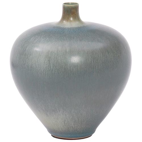 Friberg vase, light blue and green hare's fur matt glaze, signed with incised mark "Friberg", 6.5"h x 6"dia., mint condition