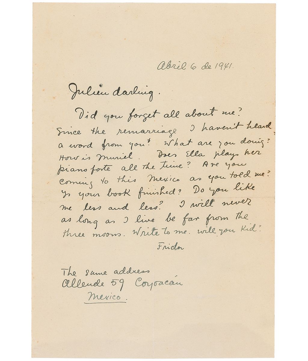 Extremely rare ALS in English, signed “Frida,” one page, 8.5 x 12.25, April 6, 1941. Letter to important New York art dealer Julien Levy. In full: “Did you forget all about me? Since the remarriage I haven’t heard a word from you! What are you doing? How is Muriel. Does Ella play her pianoforte all the time? Are you coming to this Mexico as you told me? Is your book finished? Do you like me less and less? I will never as long as I live be far from the three moons. Write to me. Will you kid?” In fine condition. Kahlo was more comfortable in her native Spanish tongue, making English autographic material uncommon.