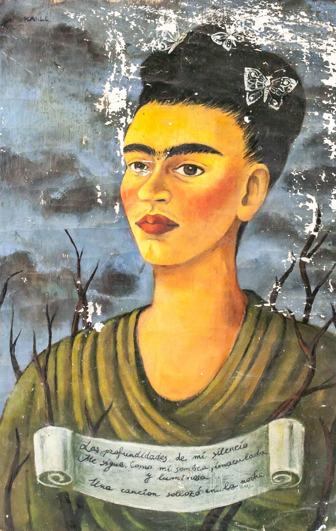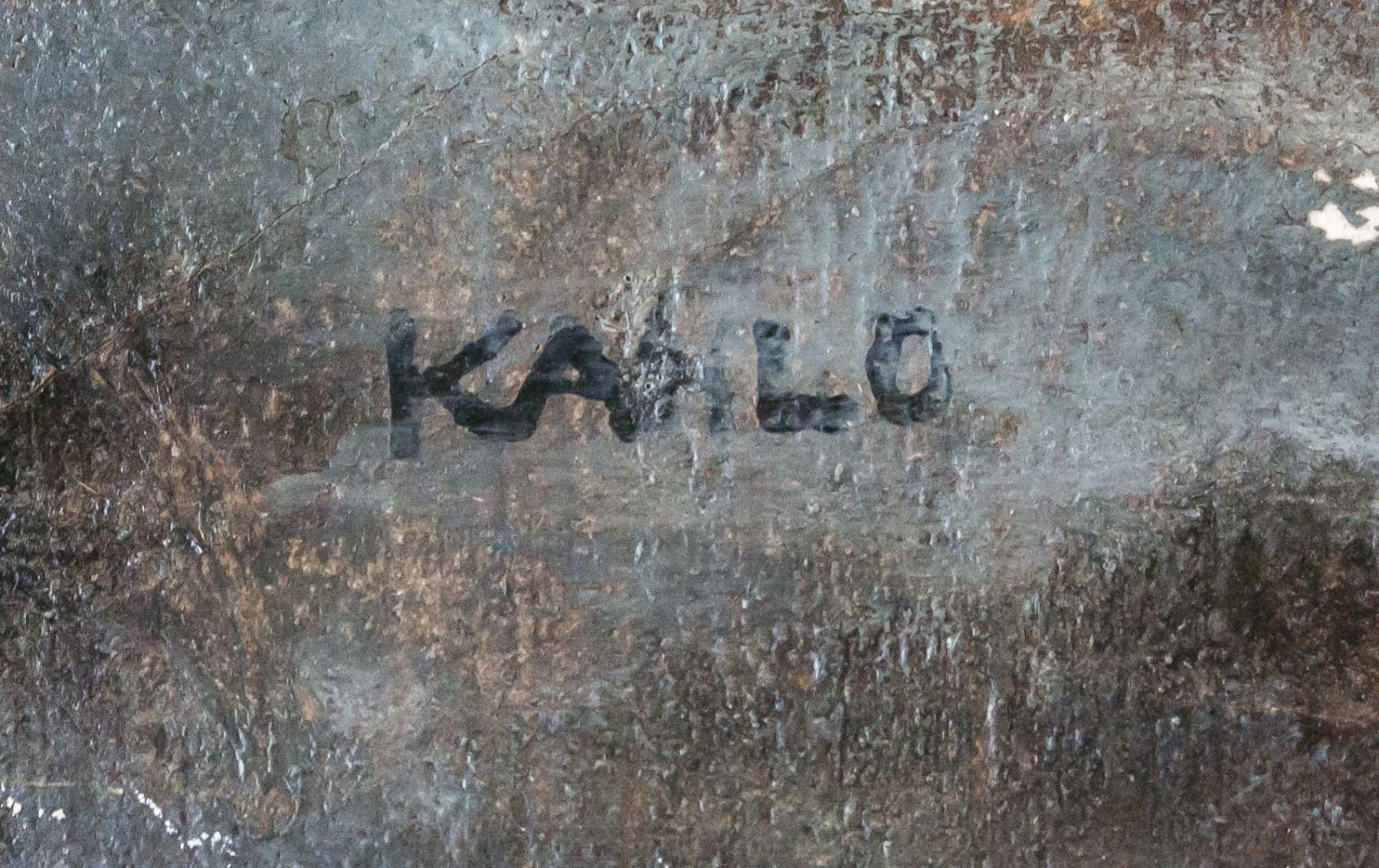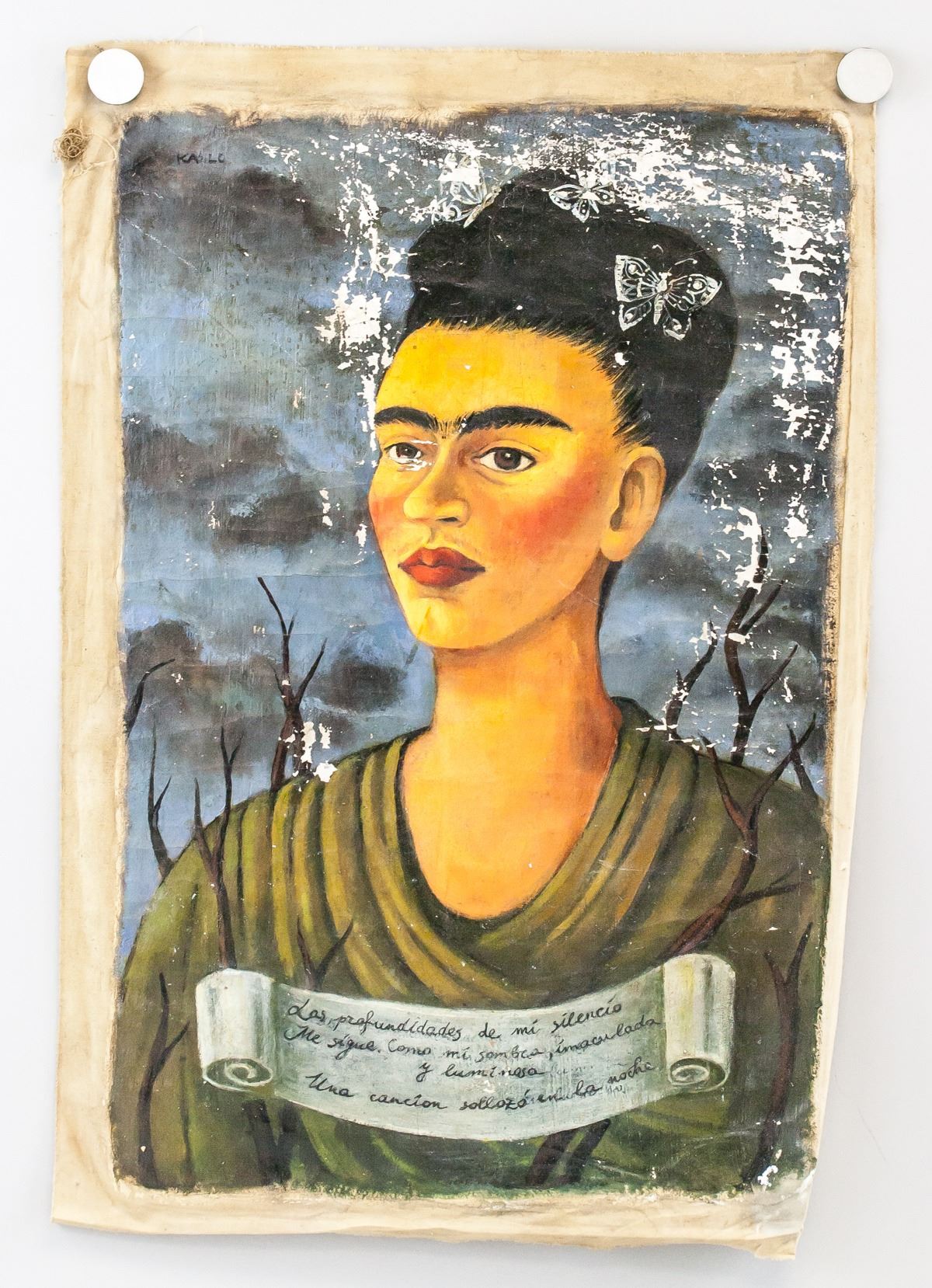 Oil on canvas. Featuring portrait of Frida Kahlo. Signed "KAHLO" in the top left corner. Label on verso reads "FISCHER-BOHLER". Illegible blue stamp on verso. Stamped "APPROVAL" on verso. Canvas damaged, oil paint flaking. Attributed to Frida Kahlo (1907-1954, Mexican). 49 x 33 cm (19 x 13 inches).
