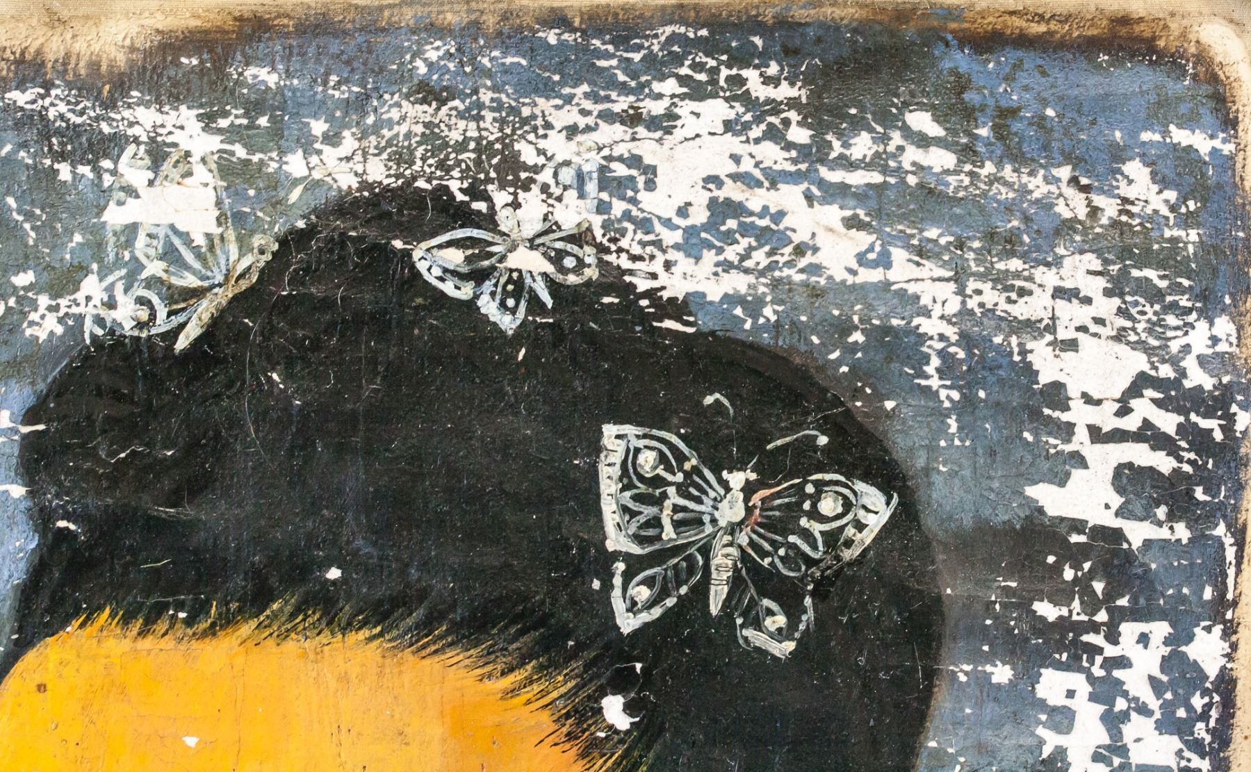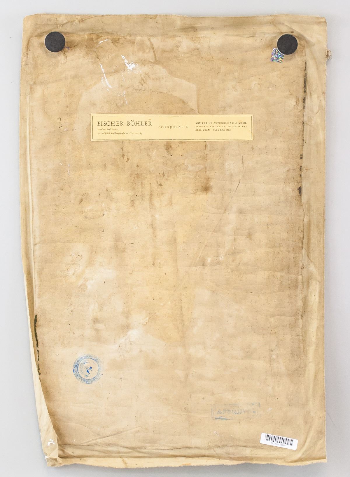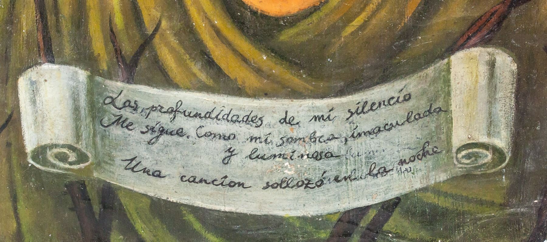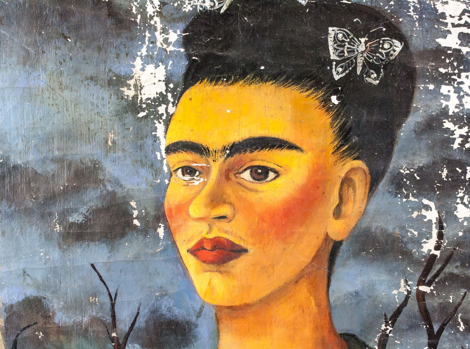 Oil on canvas. Featuring portrait of Frida Kahlo. Signed "KAHLO" in the top left corner. Label on verso reads "FISCHER-BOHLER". Illegible blue stamp on verso. Stamped "APPROVAL" on verso. Canvas damaged, oil paint flaking. Attributed to Frida Kahlo (1907-1954, Mexican). 49 x 33 cm (19 x 13 inches).