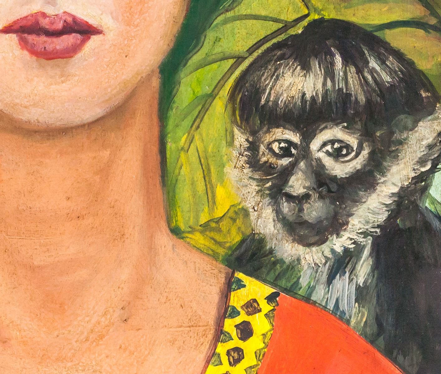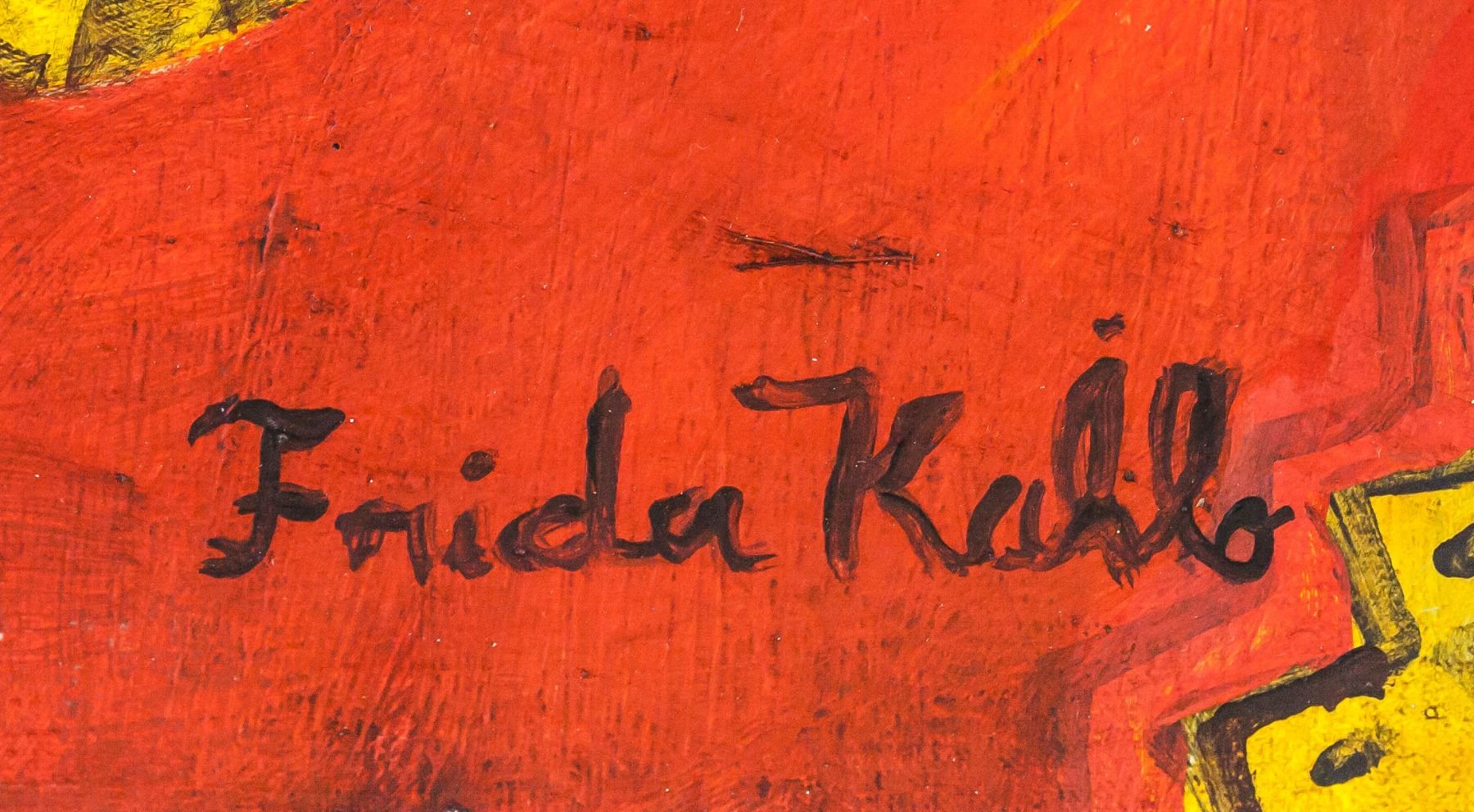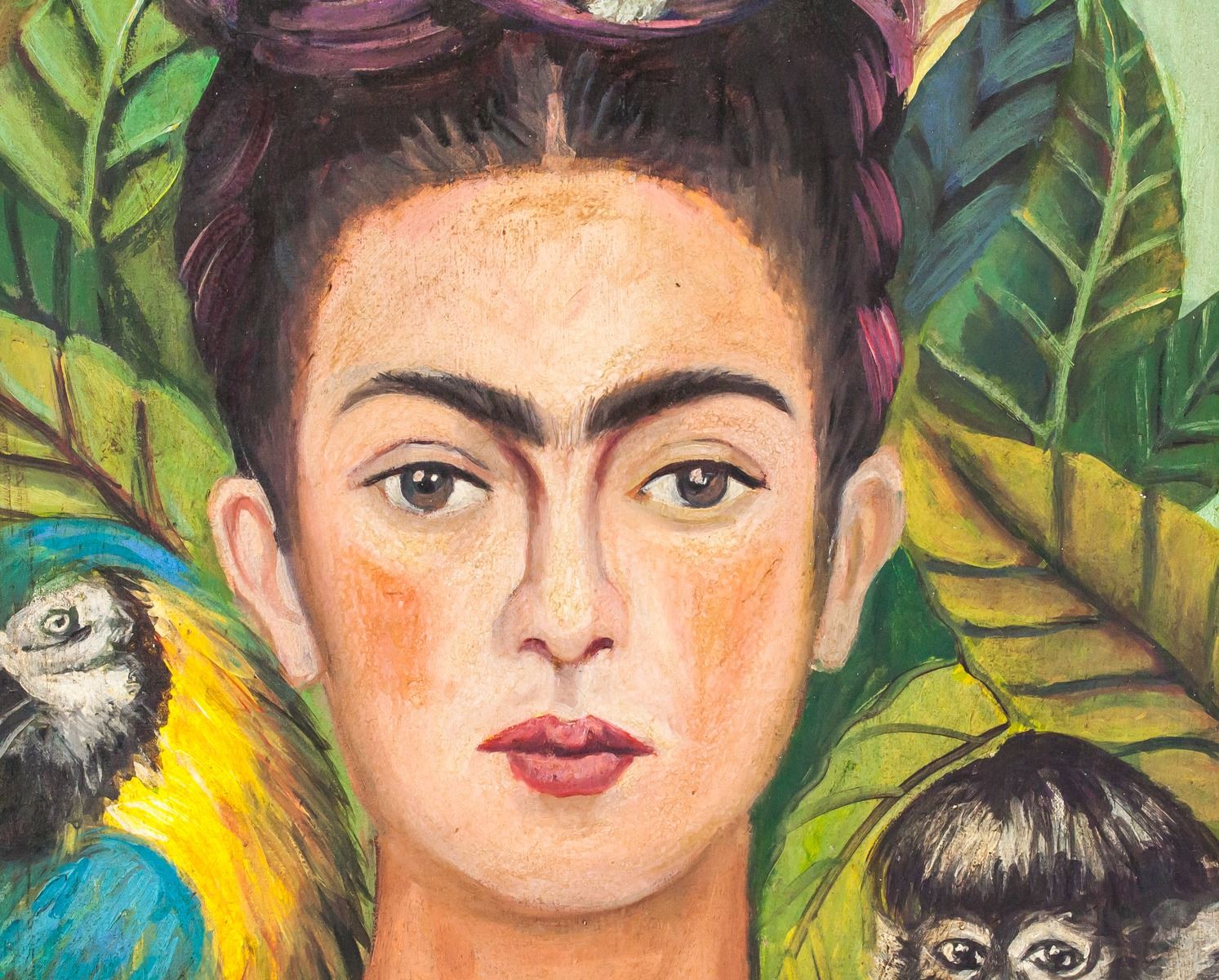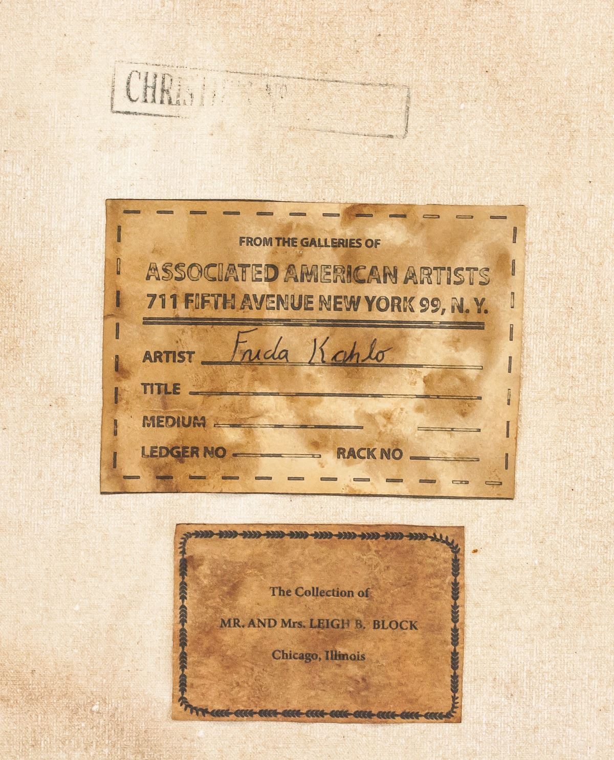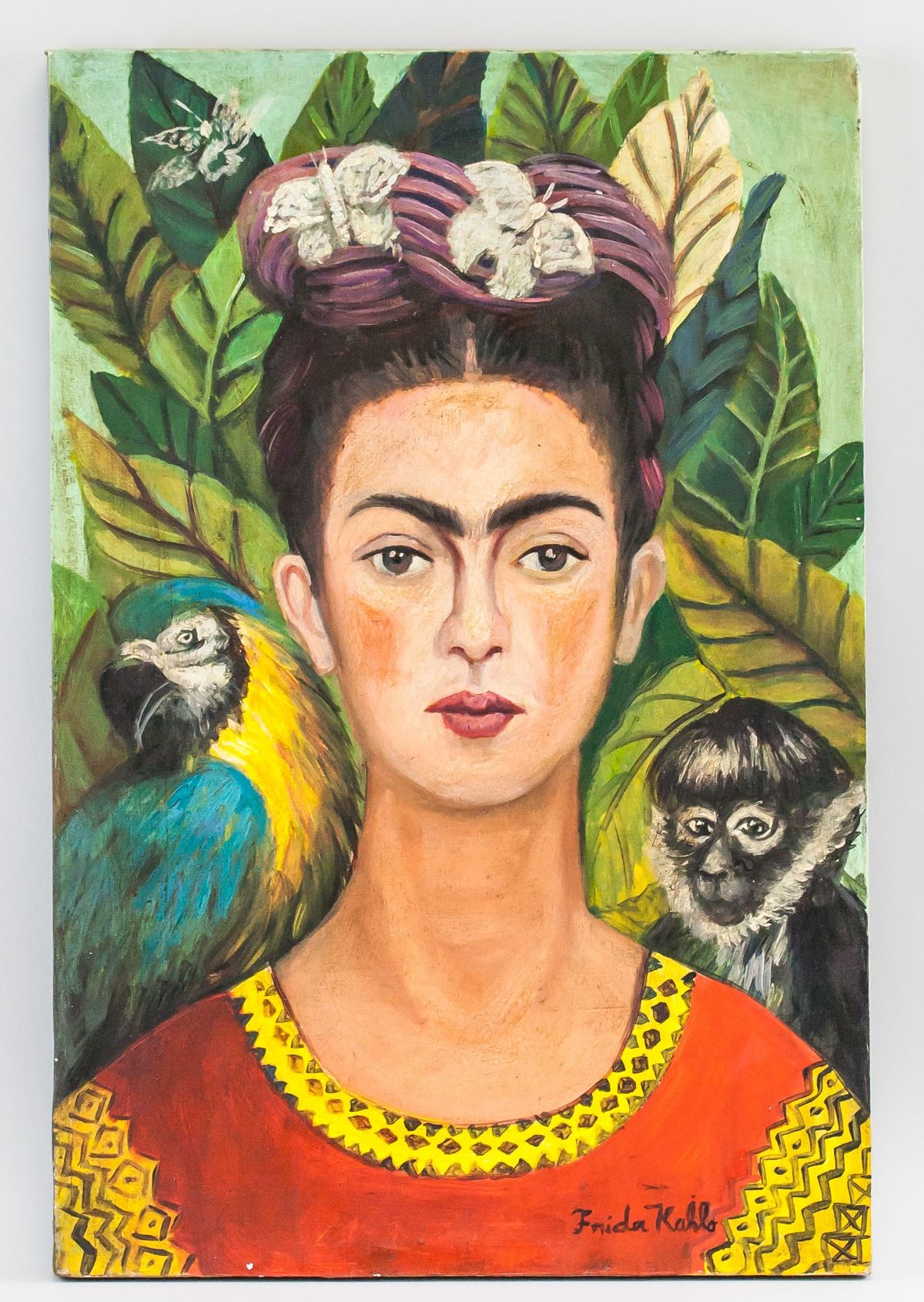 Oil on canvas. Featuring self-portrait of Frida Kahlo. Signed "Frida Kahlo" to the bottom right corner. Stamps on verso read "CHRIS[illegible]", "ZABRISLOE GALLERY 724 FIFTH AVENUE, NEW YORK 10019", and "MUSEO THYSSEN-BORNEMISZA". Labels attached to verso read "FROM THE GALLERIES OF ASSOCIATED AMERICAN ARTISTS 711 FIFTH AVENUE NEW YORK 99, N. Y. ARTIST Frida Kahlo TITLE MEDMIUM LEDGER NO RACK NO", and "The Collection of Mr. AND Mrs. LEIGH B. BLOCK Chicago, Illinois". Attributed to Frida Kahlo (1907-1954, Mexican). 59.5 x 39.5 cm (23.5 x 15.5 in). Provenance: This lot carries limited provenance from a Southern Ontario estate.