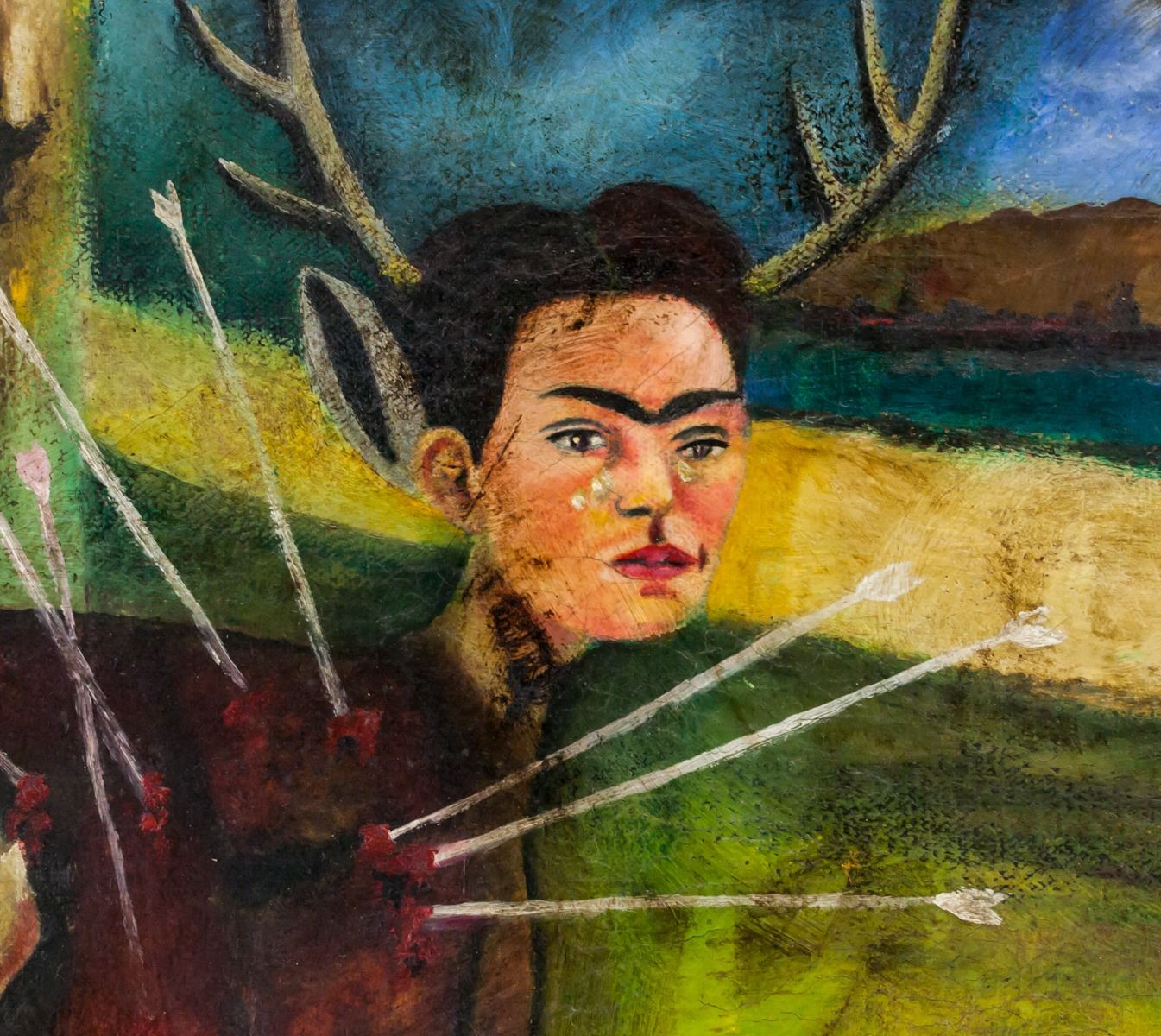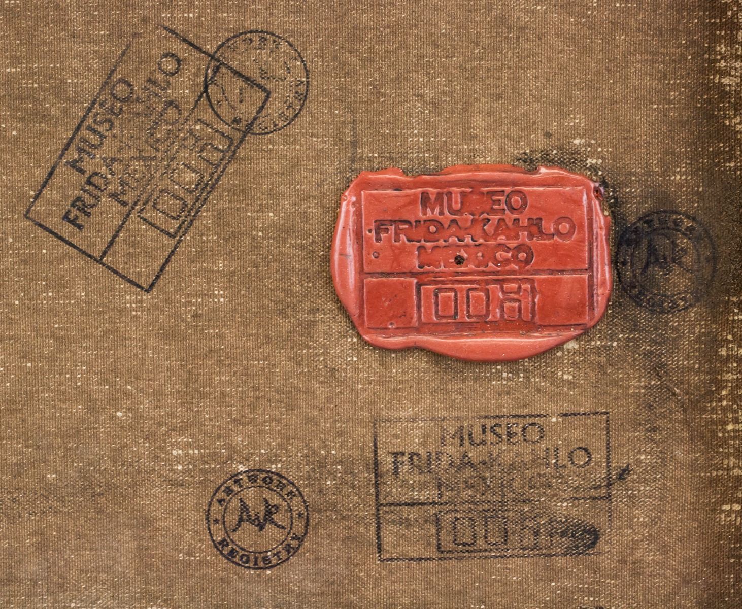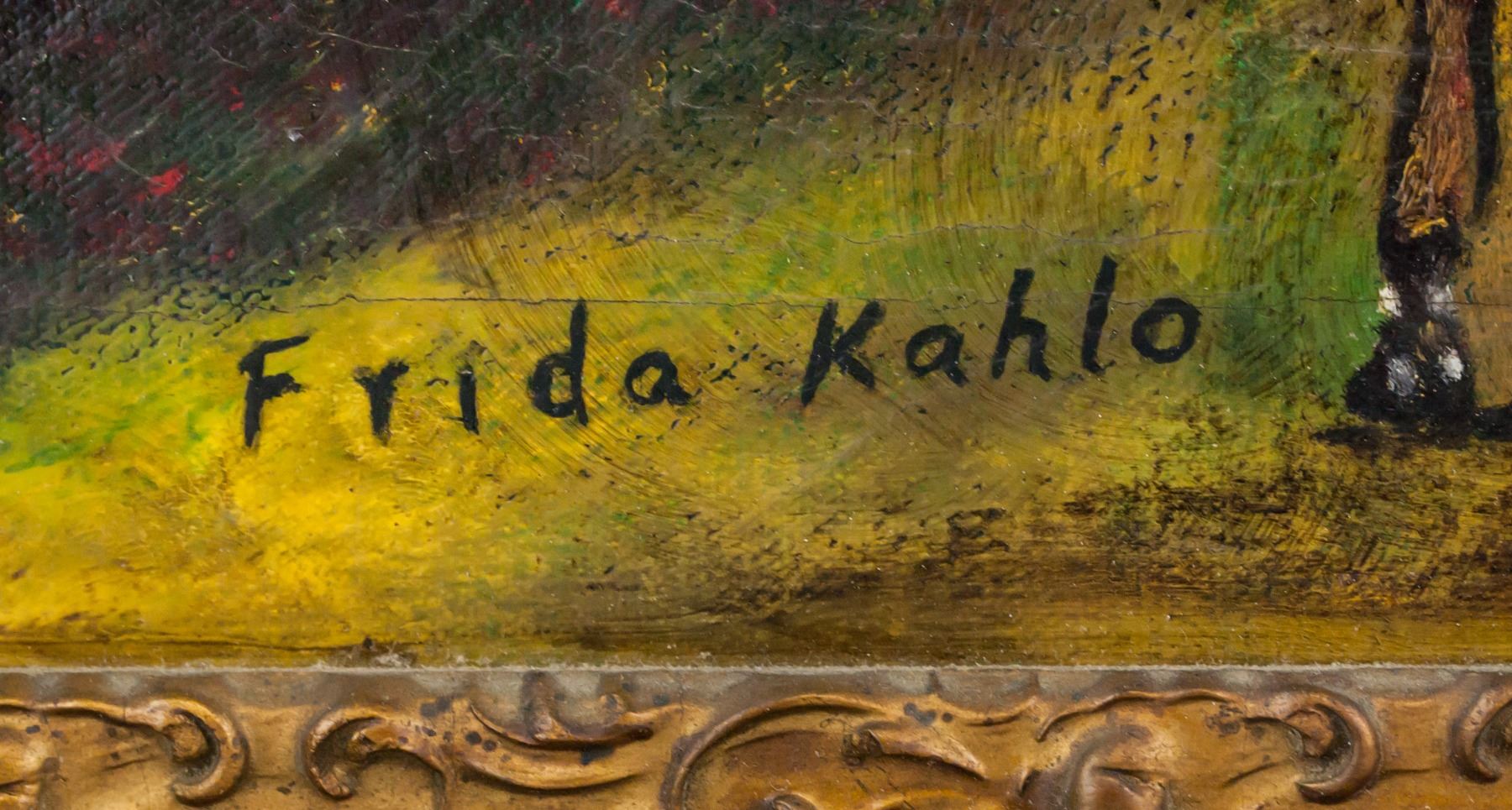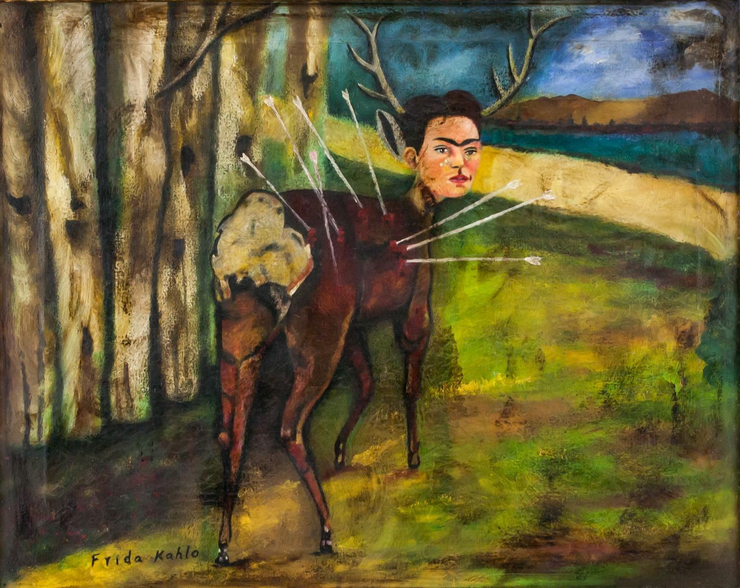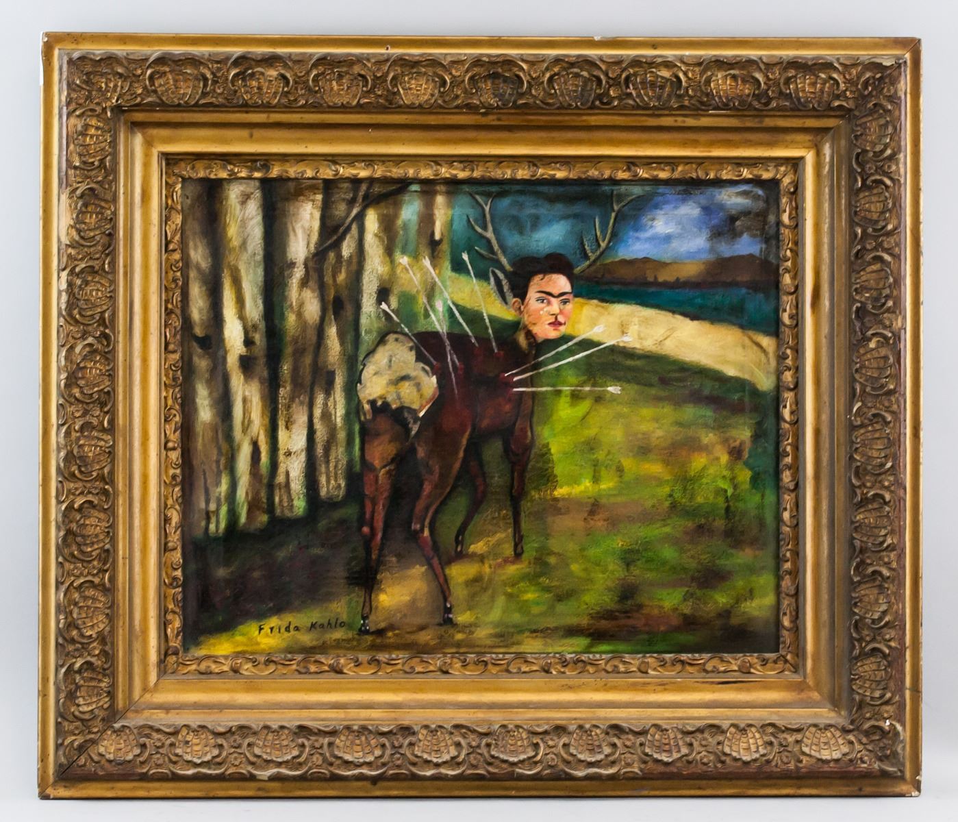 Oil on canvas, framed. Featuring a self-portrait anthropomorphized deer bearing Frida Kahlo's face pierced with arrows. Signed Frida Kahlo on the lower left corner. Red wax seal inscribed MUSEO FRIDA KAHLO MEXICO on verso. Stamped MUSEO FRIDA KAHLO MEXICO on verso. Stamped on bottom stretcher bar MUSEO FRIDA-KAHLO MEXICO. Attributed to Frida Kahlo (1907-1954, Mexican). 43 x 53 cm (16 x 20.5 inches). Framed ize: 63 x 73 cm (24.75 x 28.75 inches). PROVENANCE: This item has limited provenance from a private Toronto collection