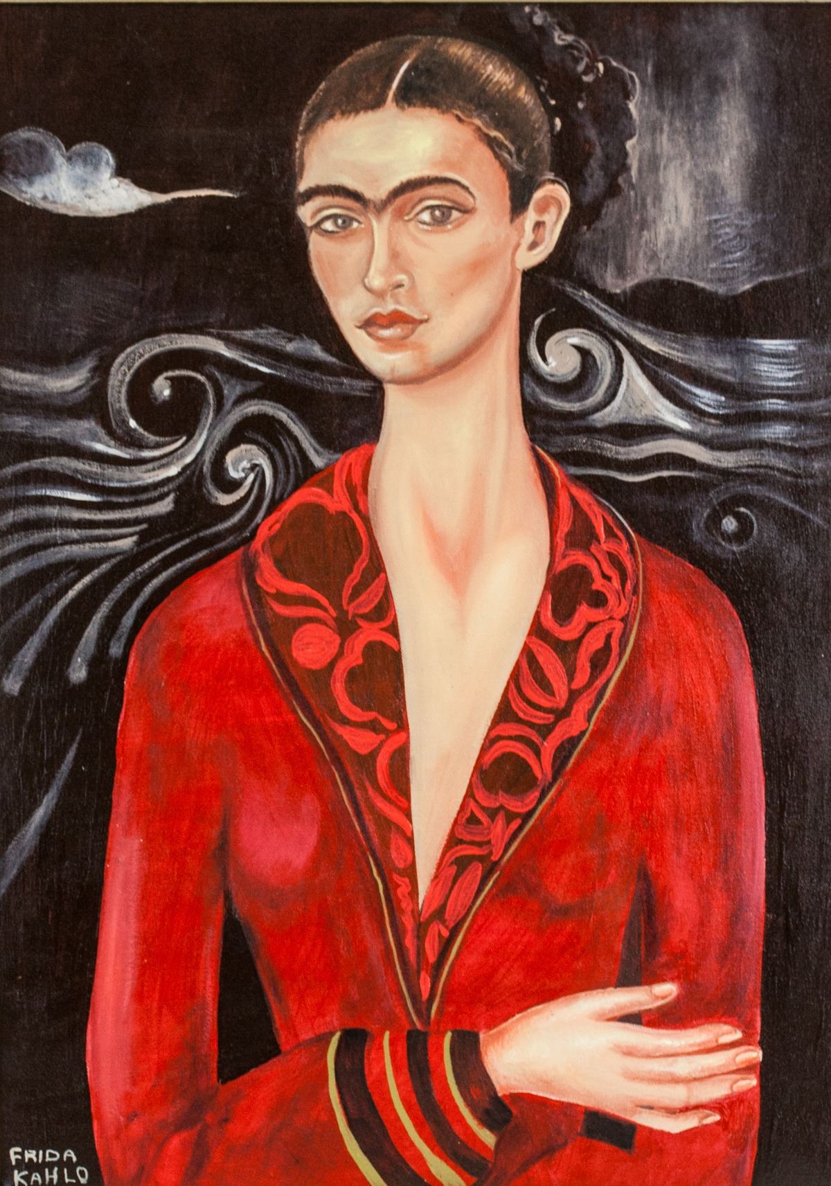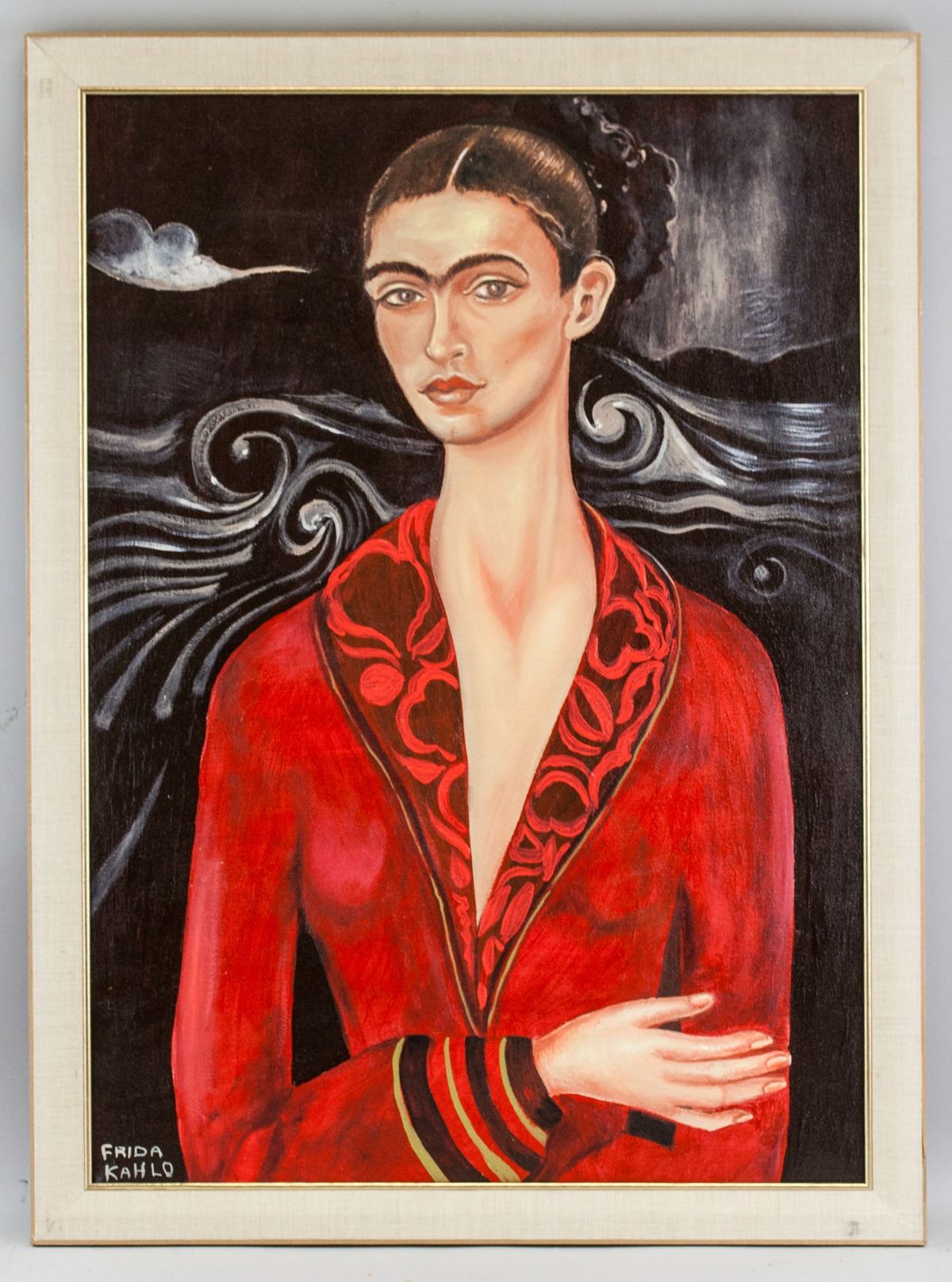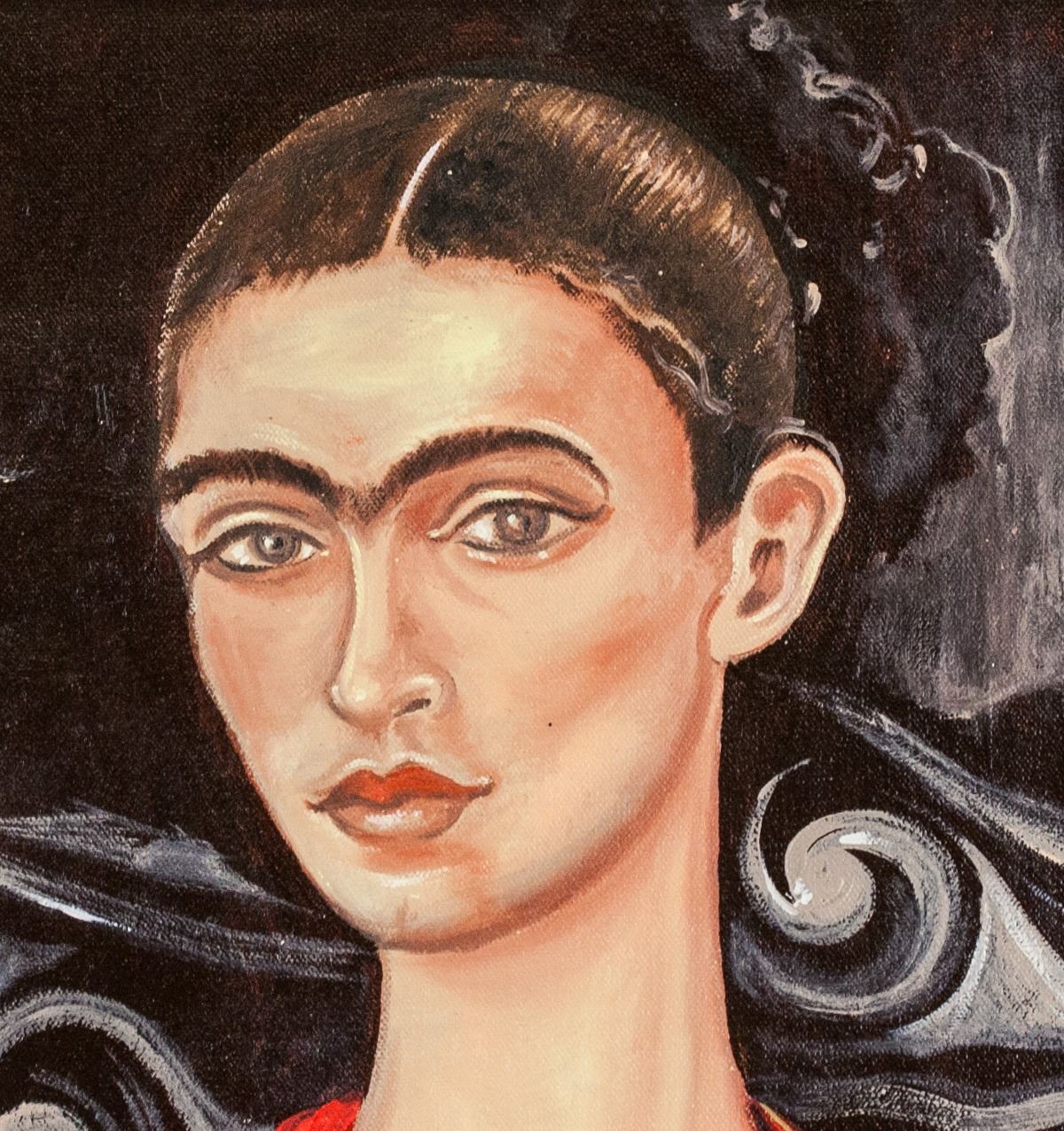 Oil on canvas, framed. Featuring a self-portrait. Signed FRIDA KAHLO on the lower left corner. Stamped BANCO de MEXICO on verso stretchbar. Label affixed to verso inscribed FROM THE GALLERIES OF ASSOCIATED AMERICAN ARTISTS 711 FIFTH AVENUE NEW YORK 99, NY. Attributed to Frida Kahlo (1907-1954, Mexican). 70 x 50 cm (27.6 x 19.7 inches). Framed size: 78 x 57.5 cm (30.7 x 22.6 inches). PROVENANCE: This lot carries limited provenance from a Southern Ontario estate