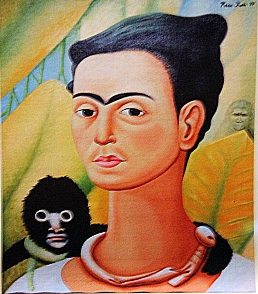 Oil on paper in the manner of in the manner of Frida Kahlo "Self Portrait with Monkey", circa 1947, private collection, unframed dimensions approximately 24x20. in the manner of Frida Kahlo, in full in the manner of Frida Kahlo de Rivera, original name Magdalena Carmen in the manner of Frida Kahlo y Calderón (born July 6, 1907, Coyoacán, Mex.—died July 13, 1954, Coyoacán) Mexican painter noted for her intense, brilliantly coloured self-portraits painted in a primitivistic style. Though she denied the connection, she is often identified as a Surrealist. She was married to muralist Diego Rivera (1929, separated 1939, remarried 1941).