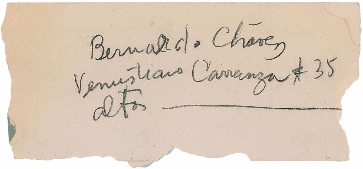Hand-addressed mailing envelope panel, 9.5 x 4.25, addressed by Kahlo in pencil, “Bernardo Chavez, Venustiano Carranza #35, alto.” In very good condition, with a fold to the left side, rough edges, and dampstaining to upper right corner. Autographic material from Kahlo is exceedingly rare and this address panel presents a large, very bold example.