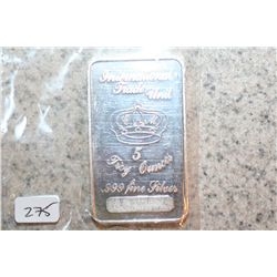 This lot is a 5 oz. (.999) silver bar; international trade unit