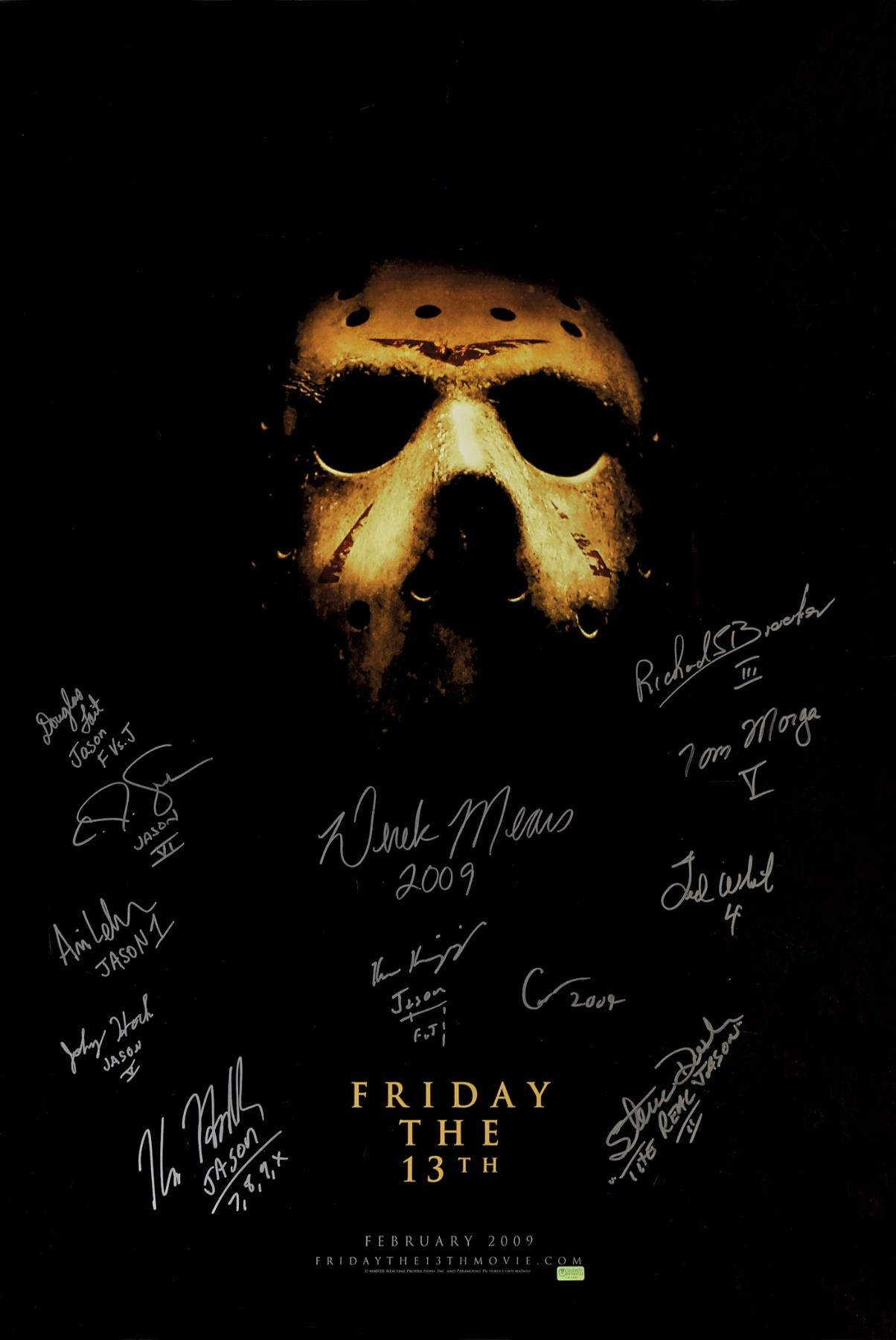 Color 40 x 27 one sheet movie poster for the 2009 horror film Friday the 13th, signed in silver ink by twelve actors or stunt performers who played Jason Voorhees in the Friday the 13th film series, including: "Ari Lehman, Jason 1," "Steve Dash, 'The Real Jason,' II," "Ted White, 4," "Tom Morga, V," "Johnny Hock, Jason V," "C. J. Graham, Jason VI," "Kane Hodder, 7, 8, 9, X," "Ken Kirzinger, Jason, FvJ," "Douglas Tait, Jason F Vs. J," "Derek Mears, 2009," "Richard S. Brooker, III," and "Caleb Guss, 2009." Rolled and in fine condition.
