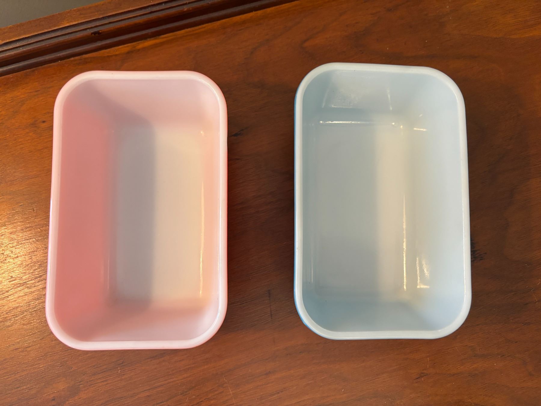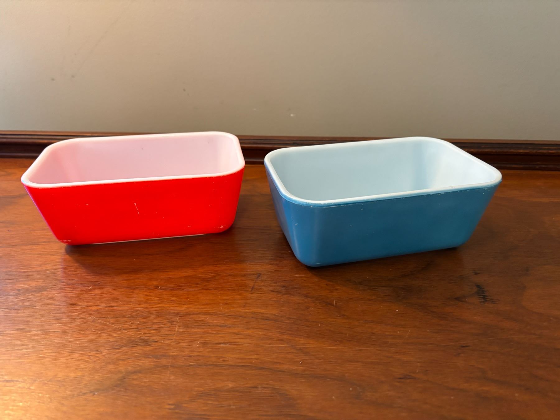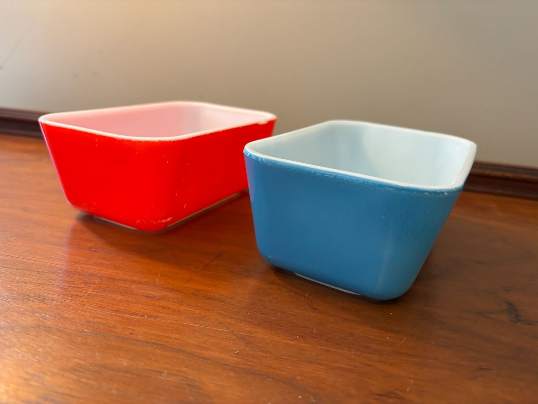 Blue and red pyrex fridge without lids, paint in fair condition with minimal fading/nicks, 16.5cm x 11cm