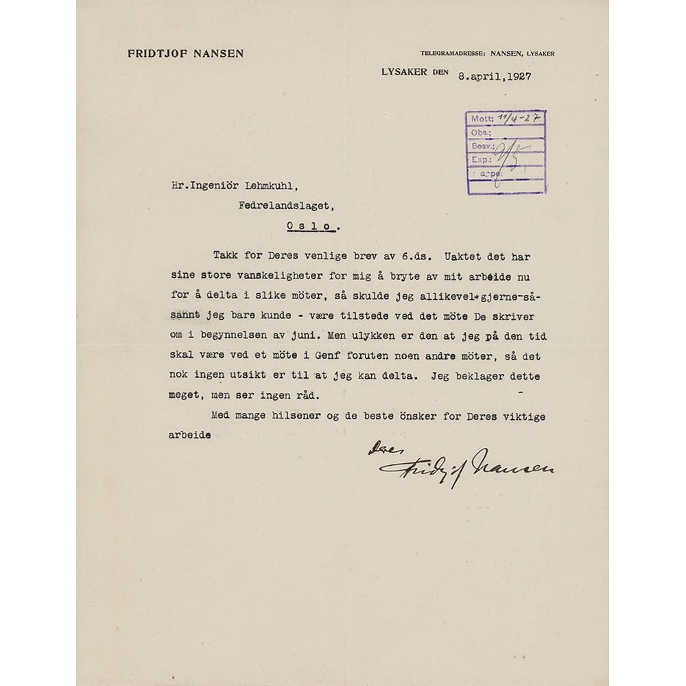 Norwegian explorer, scientist, diplomat, humanitarian, and Nobel laureate (1861–1930) who led the first crossing of the Greenland interior in 1888. TLS in Norwegian, one page, 8.75 x 11.25, personal letterhead, April 6, 1927. Untranslated letter to an engineer, boldly signed at the conclusion by Fridtjof Nansen. In fine condition.