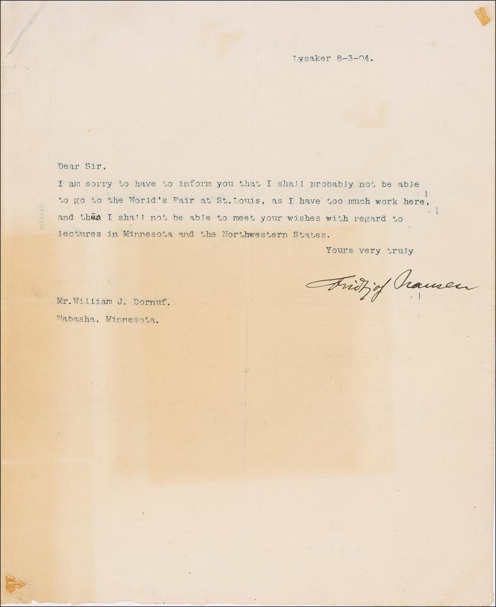 Norwegian explorer, scientist, diplomat, humanitarian, and Nobel laureate (1861-1930) who led the first crossing of the Greenland interior in 1888. TLS, one page, 9 x 11, August 3, 1904. Letter to a gentleman in Minnesota. In full: “I am sorry to inform you that I shall probably not be able to go to the World’s Fair at St. Louis, as I have too much work here, and that I shall not be able to meet your wishes with regard to lectures in Minnesota and the Northwestern States.” Partial separations to central horizontal and vertical folds, several blocks of toning, one affecting first name of signature, corner creases, and small tape remnants to corners, otherwise very good condition.