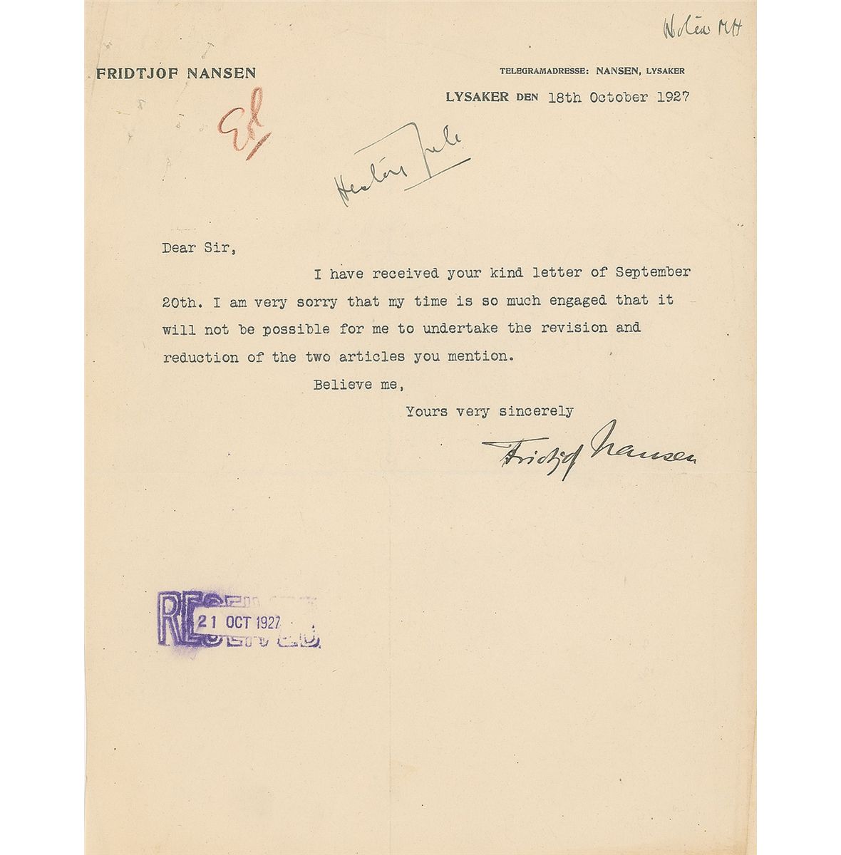Norwegian explorer, scientist, diplomat, humanitarian, and Nobel laureate (1861–1930) who led the first crossing of the Greenland interior in 1888. Uncommon TLS, one page, 8 x 10.25, personal letterhead, October 18, 1927. Letter to a gentleman. In part: “I am very sorry that my time is so much engaged that it will not be possible for me to undertake the revision and reduction of the two articles you mention.” Central vertical and horizontal folds, scattered creases, staple holes to upper left, various office stamps and notations, and slightly trimmed edges, otherwise fine condition.