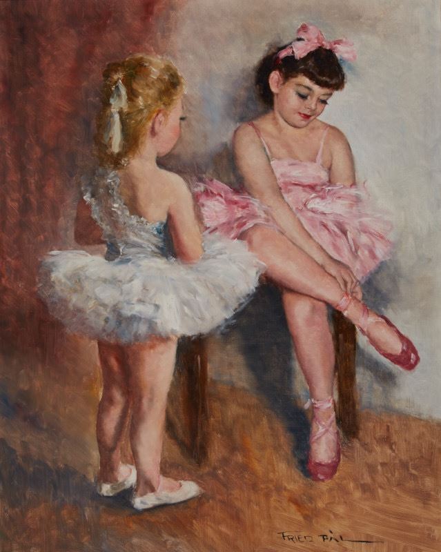 To the unaided eye, this piece appears to be in good condition. Inspection under ultraviolet light reveals two areas of restoration. The first appears to have been about a 1 inch tear in the canvas located just above the center of the piece, on the left-hand side of the pink tutu. There is a 1 inch square exhibiting signs of inpainting, as well as a visible patch on the back side of the canvas. The second area with signs of restoration is about 1/4 inch wide and 1/2 inch high and is located 6 inches from the left and 6 inches from the top of the piece. This area has also been visibly patches on the back of the canvas. This piece is framed in an ornate, pale antiqued gold frame with a matching liner. The frame is in good condition, separtating slightly at the corners, but generally showing normal signs of wear. Verso: [handwritten on back of canvas] Willing to Learn; 25054; [stamped on back of canvas] The copyright of this painting is the property of the artist and is stictly reserved.