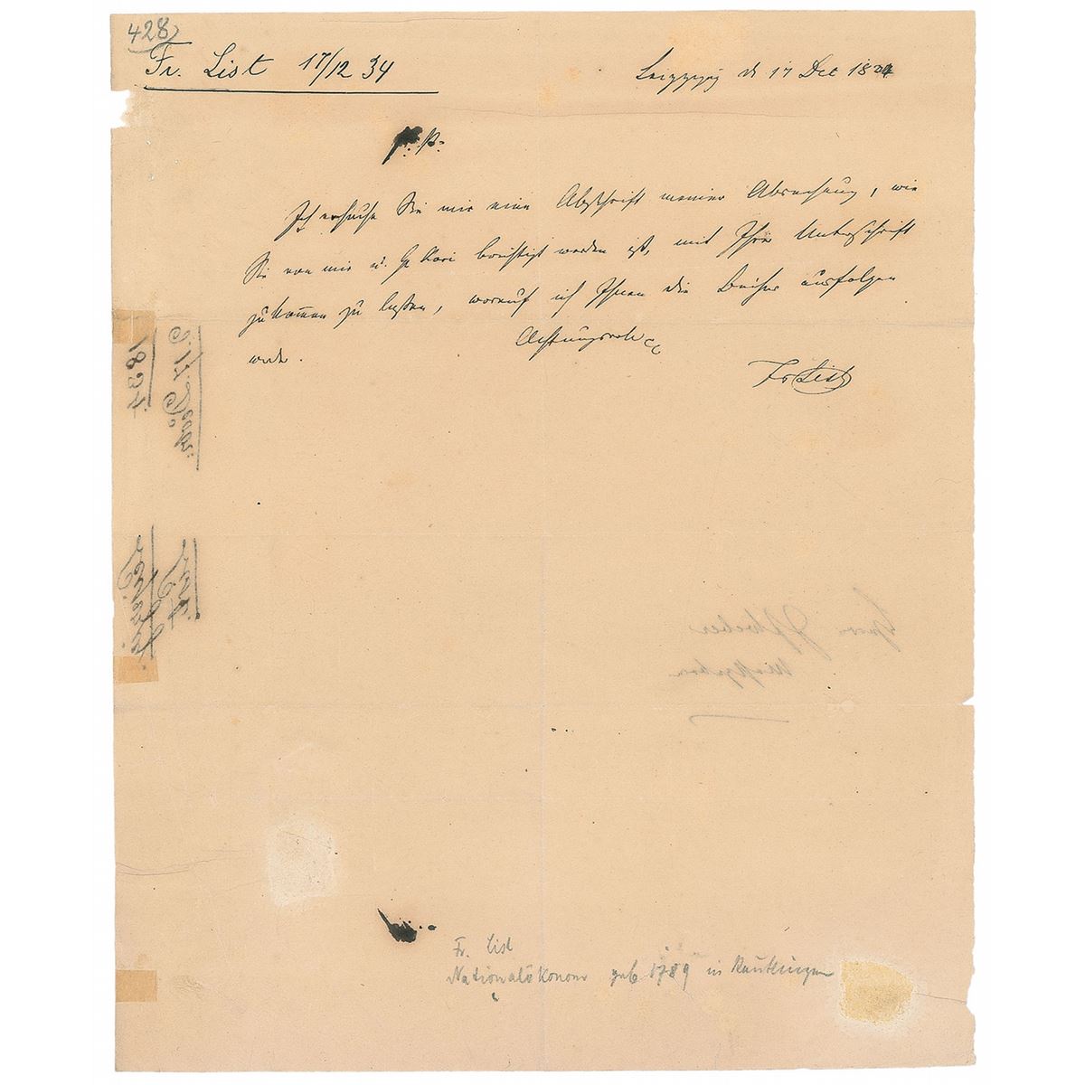 Leading 19th-century economist considered the original European unity theorist, best known for developing the ‘National System’ (1789–1846). ALS in German, signed “Fr. List,” one page, 8.25 x 10, December 17, 1834. Untranslated letter to publisher Johann Jacob Weber in Leipzig regarding the delivery of books. In very good condition, with intersecting folds, some tape remnants to left edge, and show-through from docketing to reverse.