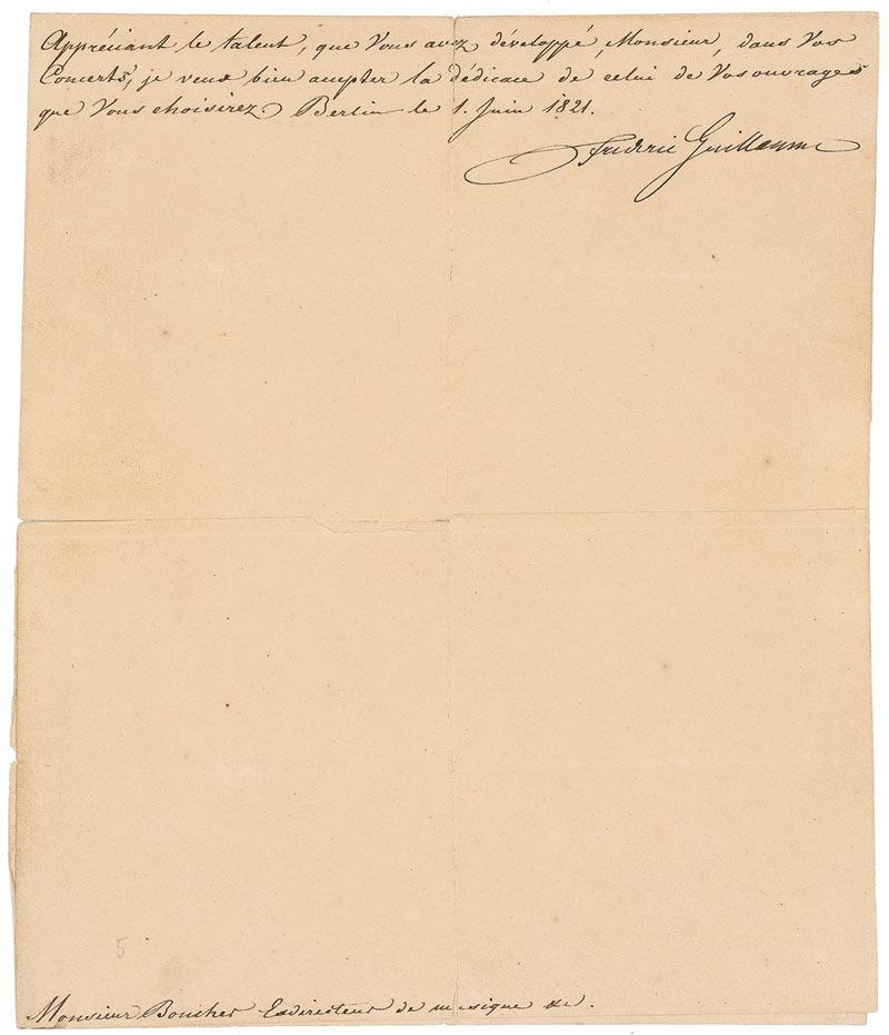 King of Prussia from 1797 to 1840. ALS in French, one page, 8.25 x 9.5, June 1, 1821. Brief untranslated letter to Monsieur Boucher. In very good condition, with bisecting folds, light overall toning, and tape repair to partial separation of horizontal fold. RRAuction COA.