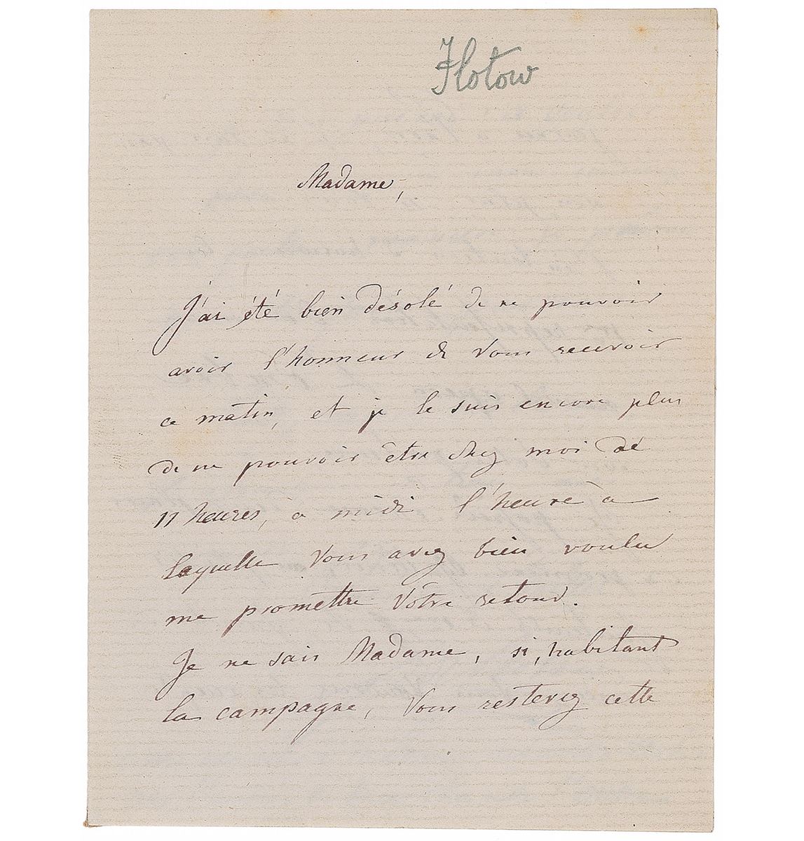 German composer (1812-1883) chiefly remembered for his opera Martha, which was popular in the 19th century. ALS in French, signed “Fr. de Flotow,” three pages on two adjoining sheets, 4 x 5, July 7, 1870. Letter to the singer Desiree Artot de Padilla expressing his regret over a missed meeting, and requesting her presence at the first performance of his new opera L'Ombre. In fine condition.