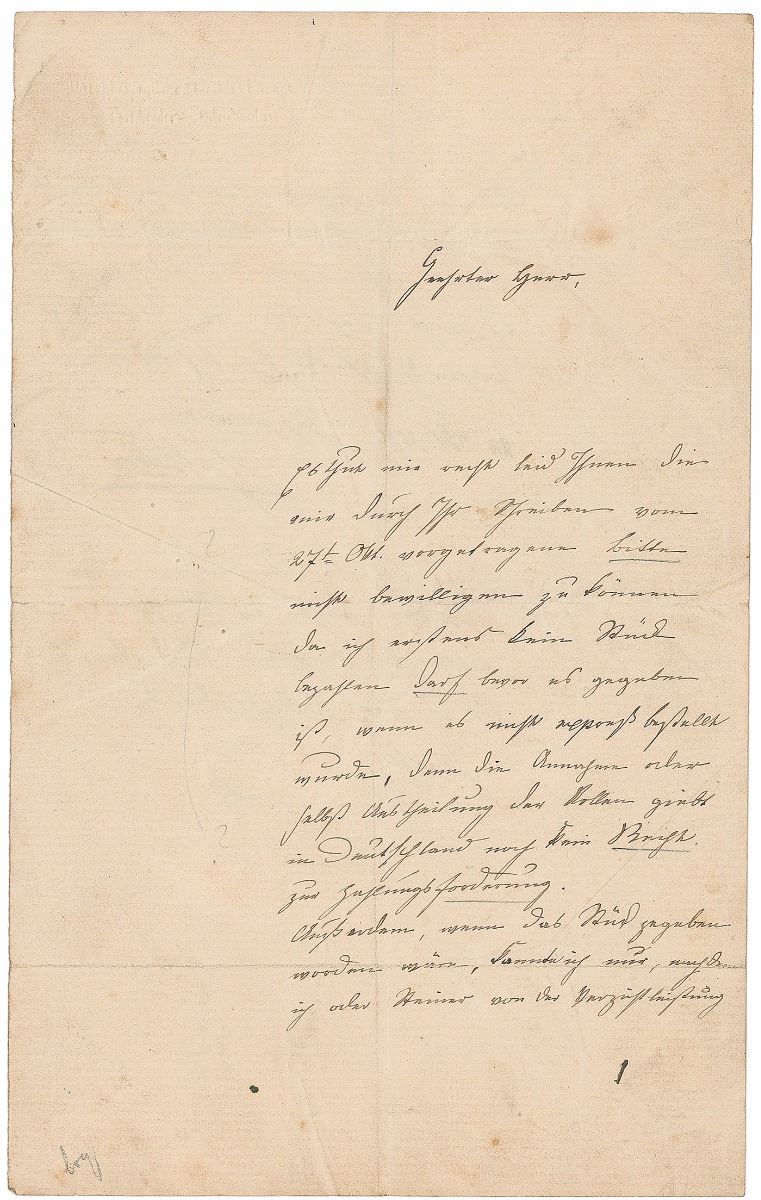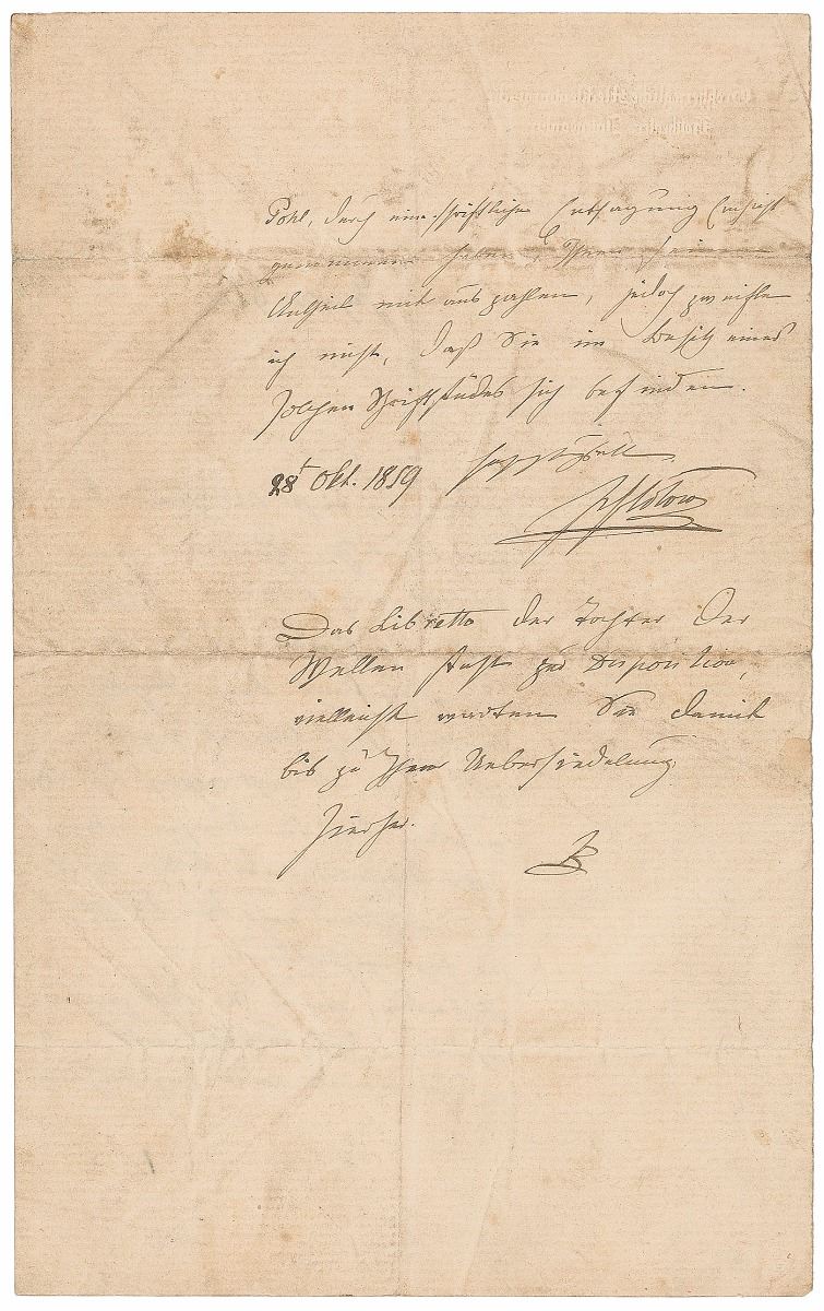 German composer (1812-1883) chiefly remembered for his opera Martha, which was popular in the 19th century. ALS in German, signed “Fr. Flotow,” one page both sides, 5.25 x 8.5, October 28, 1859. In full (translated): “I am very sorry not to be able to grant the request contained in your letter of the 27th Oct. as in the first place, I dare not pay for a piece before it is performed, unless it be specially ordered, for in Germany the acceptance or even distribution of the parts does not confer a right to demand payment. Besides, if the piece had been performed, only after I or Steiner had seen a written guarantee of the renunciation of Pohl could I pay you his share; however I doubt not but that you are in possession of such a document.” Flotow adds a postscript at the conclusion, “The libretto of the ‘Daughter of the Waves’ is at your disposal, perhaps you will wait for it until your removal here.” In very good condition, with intersecting folds and scattered creasing and soiling.
