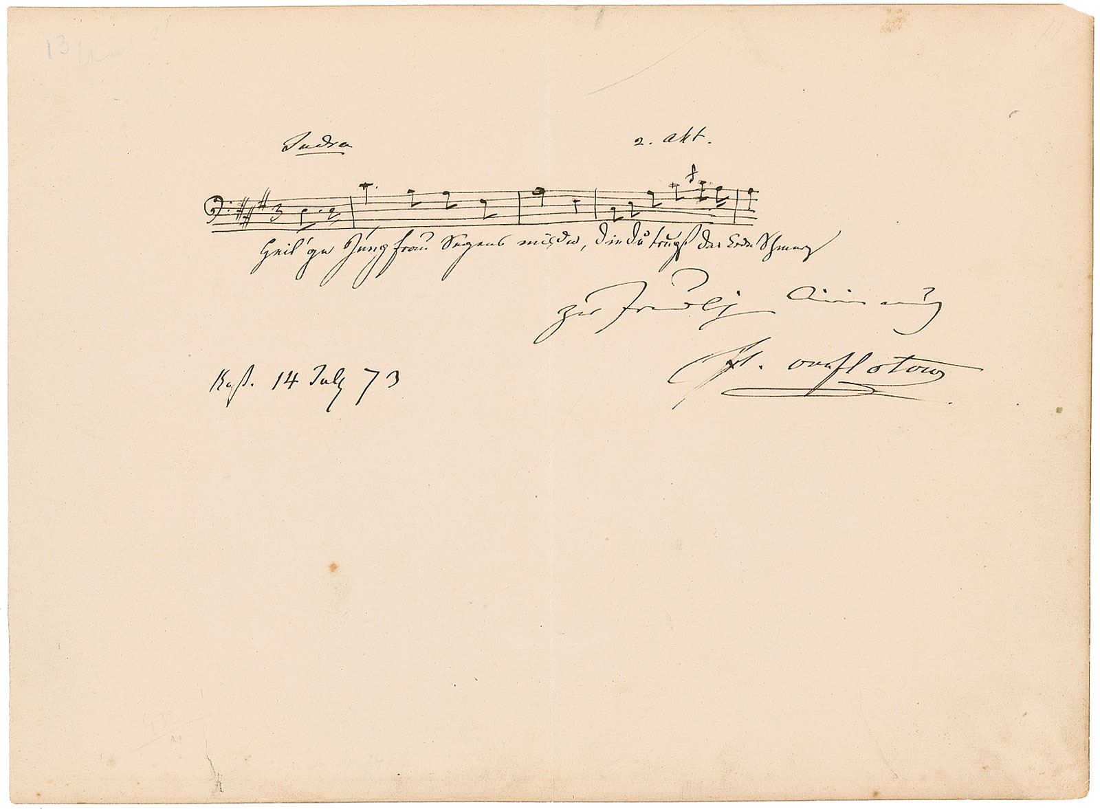German composer (1812–1883) chiefly remembered for his opera Martha, which was popular in the 19th century. Intricate AMQS, signed "Fr. von Flotow," on an off-white 10 x 7.25 sheet. Flotow pens five bars of music and lyrics from the second act of his 1852 opera Indra, signed at the conclusion and dated July 14, 1873. In fine condition, with a central vertical fold, and some creasing to the top edge.