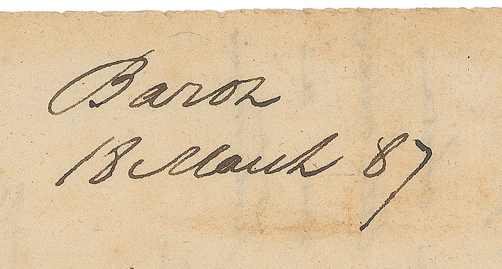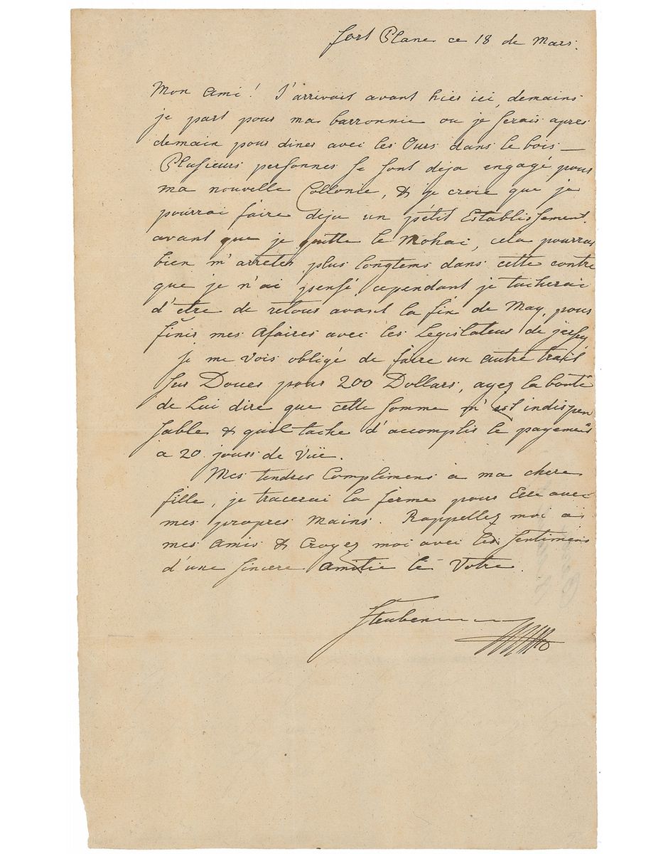 Prussian soldier (1730–1794) who provided invaluable aid to the American Revolution, joining George Washington at Valley Forge. ALS in French, signed “Steuben,” one page, 7.5 x 12, March 18, [1787]. Letter to a friend, written from Fort Plain, a Mohawk Valley settlement about midway between Albany and Utica. In full (translated): “I arrived here the day before yesterday. Tomorrow I leave for my barony where I’ll be the day after tomorrow to dine with the bears in the woods. Several people have already made commitments to my new colony, and I believe I could already create a small settlement before leaving the Mohawk [Valley]. That might well keep me in the area longer than I planned. In any case I’ll try to be back before the end of May to finish my business with the Jersey legislators. I am obliged to make another draft on Douer for 200 dollars. Be so kind as to tell him it’s essential that I have that sum and tell him to try to make payment within 20 days. My tender compliments to my dear daughter. I’ll lay out the farm for her with my own hands.” While the letter is only dated March 18, the year is indicated by a contemporary docketing notation to reverse. In fine condition, with intersecting folds and one tiny edge separation repaired with tape to reverse. Accompanied by an engraved portrait of von Steuben bearing a facsimile signature. Other than the 16,000 acre tract of land in the Mohawk Valley region that von Steuben was granted by the New York legislature, he received little compensation for his successful efforts during the war. At the time he penned this letter, he was at his lowest financial point—essentially bankrupt—and he was attempting to protect his land from creditors. Despite the vast estate, his property did little to provide him with any business or trade opportunities due to its isolation—after resettling there in 1788, his advisor declared that all income was to be ‘sacredly appropriated to paying his debts and with the remainder he must live [as] a recluse till the new Government decides his affairs.’ This 'new Government' was established with the ratification of the Constitution, and after Washington became president in 1789 von Steuben was awarded a pension that helped to ease these financial pressures.