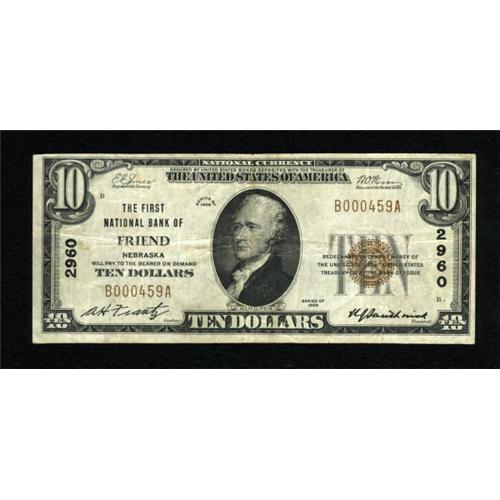 <B>Friend, NE</B></I> - $10 1929 Ty. 1 <B>The First NB</B></I> Ch. # 2960<BR> The last time a note on this Saline County bank crossed the auction block under our auspices was in 2000. This town has one of the more interesting names in Nationaldom. <B>Very Fine</B></I>.<BR><BR><b>Shipping:</b> Coins & Currency (<a target="_blank" href="http://www.heritageauctions.com/common/shipping.php">view shipping information</a>)