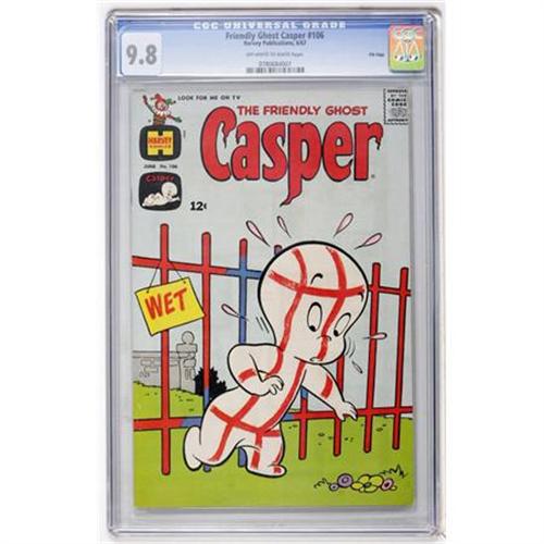 <B>Friendly Ghost Casper #106 File Copy (Harvey, 1967) CGC NM/MT 9.8 Off-white to white pages.</B></I> Highest-graded copy certified by CGC to date. Overstreet 2007 NM- 9.2 value = $22. CGC census 1/08: 1 in 9.8, none higher.<BR><BR><b>Shipping:</b> Comics - Slabbed (certified) (<a target="_blank" href="http://www.heritageauctions.com/common/shipping.php">view shipping information</a>)