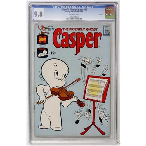 <B>Friendly Ghost Casper #62 File Copy (Harvey, 1963) CGC NM/MT 9.8 Off-white pages.</B></I> Overstreet 2007 NM- 9.2 value = $32. CGC census 10/07: 1 in 9.8, none higher.<BR><BR><b>Shipping:</b> Comics - Slabbed (certified) (<a target="_blank" href="http://www.heritageauctions.com/common/shipping.php">view shipping information</a>)