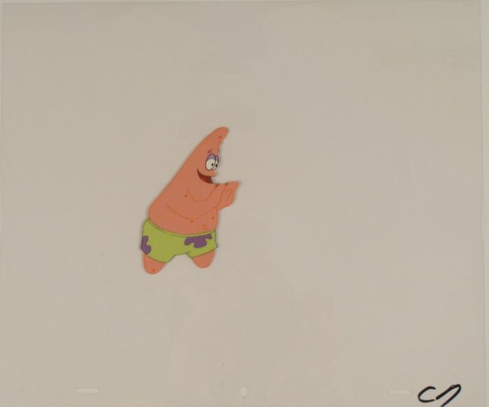 This original animation cel is from the Nickelodeon TV show SpongeBob Squarepants. The story takes place under the deep blue sea in Bikini Bottom, where SpongeBob resides. SpongeBob, who is a yellow, porous sponge, is your typical happy-go-lucky character, as he is always cheerful and enjoys making people laugh. Patrick Star, SpongeBob's neighbor who is a starfish, is your average children's show idiot, as he boasts knowing nothing and is often getting himself into ridiculous situations. Between the homes of these two lies the home of the miserable Squidward, a squid, who is known for being grouchy and playing tricks on SpongeBob and Patrick. Both SpongeBob and Squidward work at the Krusty Krab, a fast food business run by the greedy money-loving Mr. Krabs, a crab, the arch rival of the evil, possibly misunderstood, Plankton. Another neighbor, Sandy Cheeks, an athletic squirrel who normally wears an astronaut's space suit, was introduced in "Tea at the Treedome." She spends most of her time inventing and experimenting. It's just a friendly push, you know, to get things moving.Original Production Animated Cel Overall Size of Cel: 10 1/2" x 12 1/2" Excellent ConditionThis is an original hand-painted cel set-up used in the production of an episode of "SpongeBob SquarePants." Each one-of-a-kind set-up represents a slight change in position of the characters. When individually photographed and projected in rapid succession, the images appear to move.