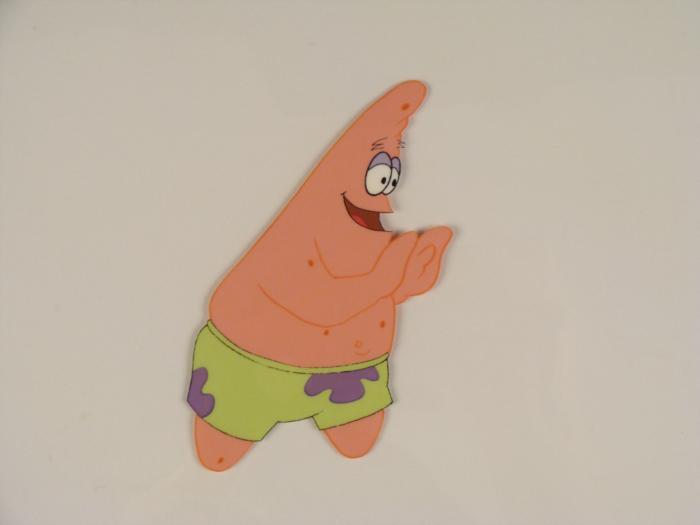This original animation cel is from the Nickelodeon TV show SpongeBob Squarepants. The story takes place under the deep blue sea in Bikini Bottom, where SpongeBob resides. SpongeBob, who is a yellow, porous sponge, is your typical happy-go-lucky character, as he is always cheerful and enjoys making people laugh. Patrick Star, SpongeBob's neighbor who is a starfish, is your average children's show idiot, as he boasts knowing nothing and is often getting himself into ridiculous situations. Between the homes of these two lies the home of the miserable Squidward, a squid, who is known for being grouchy and playing tricks on SpongeBob and Patrick. Both SpongeBob and Squidward work at the Krusty Krab, a fast food business run by the greedy money-loving Mr. Krabs, a crab, the arch rival of the evil, possibly misunderstood, Plankton. Another neighbor, Sandy Cheeks, an athletic squirrel who normally wears an astronaut's space suit, was introduced in "Tea at the Treedome." She spends most of her time inventing and experimenting. It's just a friendly push, you know, to get things moving.Original Production Animated Cel Overall Size of Cel: 10 1/2" x 12 1/2" Excellent ConditionThis is an original hand-painted cel set-up used in the production of an episode of "SpongeBob SquarePants." Each one-of-a-kind set-up represents a slight change in position of the characters. When individually photographed and projected in rapid succession, the images appear to move.