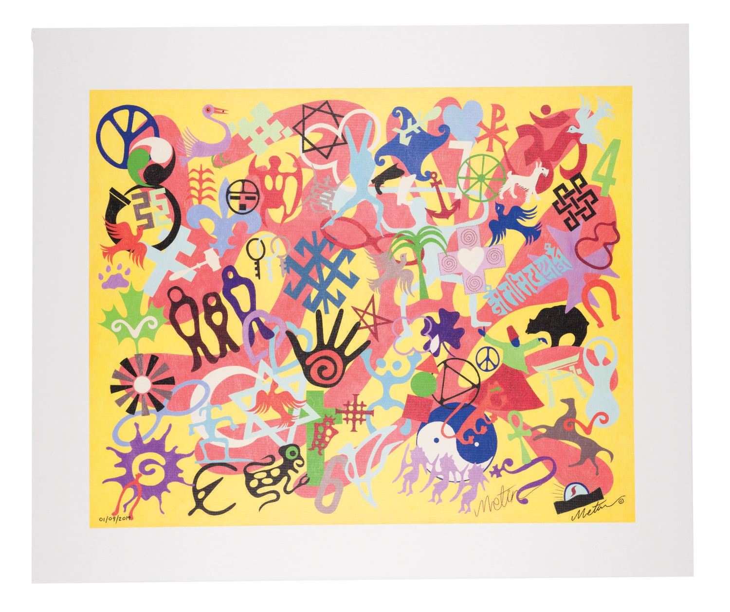 (Metin, 2019) A canvas print of "Diversity 5" by artist Metin Bereketli. The colorful work featuring a variety of cultural and religious symbols was popularized after it was featured in the Central Perk set piece on NBC's Friends. It appeared in at least 3 episodes: "The One After Joey and Rachel Kiss" (09/25/03), "The One Where Ross Is Fine" (10/02/03), and "The One With Ross's Tan" (10/09/03). Metin is a self-taught painter, born in Turkey, who moved to Virginia and then Los Angeles. He cites diversity as a special focus to his work: "My fervent wish is to bring together all peoples from all kinds of religious, ethnic, and cultural backgrounds. That's my definition of Heaven On Earth, and you can see my dedication in over a dozen original works I have created in the past." Bereketli's works have displayed in the Smithsonian Institute National Museum of Art Library, House of Blues, and the Peterson Automotive Museum. Other television shows that his works appeared in include How I Met Your Mother, Frasier, Gilmore Girls, Lucifer, General Hospital, and more. The piece, hand-dated "01-09-2019", has an image size of 24"x29.5" on its 30.25"x36" canvas linen.