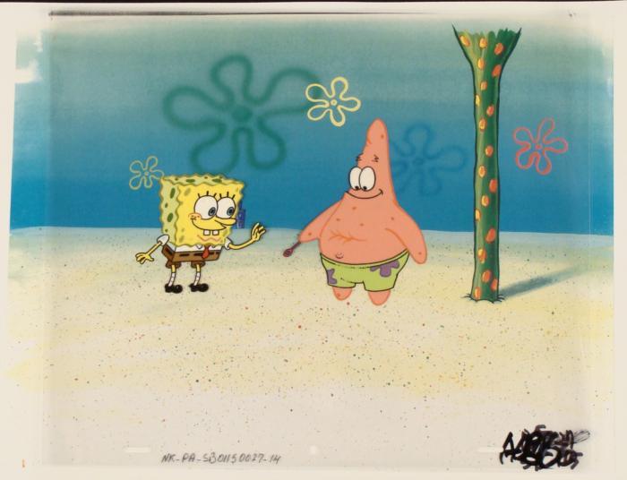To create production cels, the original animator's drawing is transferred onto an acetate cel (by hand-inking and/or photo copying). The cel is then hand-painted on the reverse side. The background accompanying this set-up is a hand-painted original production background. The printed background is ready to be matted and framed. It is a colored background with a cel and has the animator's notations at the bottom of the background and the cel. The background is a printed reproduction background. The cel has multiple layers; first is SpongeBob and the second cel is Patrick.