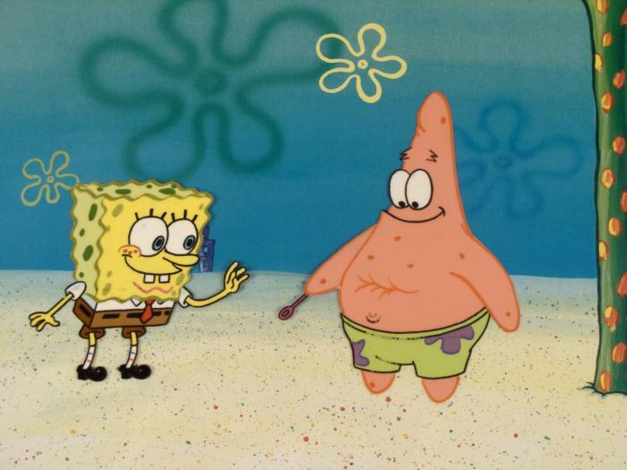 This animation cel and reproduction background are from the Nickelodeon TV show SpongeBob Squarepants. The story takes place under the deep blue sea in Bikini Bottom, where SpongeBob resides. SpongeBob, who is a yellow, porous sponge, is your typical happy-go-lucky character, as he is always cheerful and enjoys making people laugh. Patrick Star, SpongeBob's neighbor who is a starfish, is your average children's show idiot, as he boasts knowing nothing and is often getting himself into ridiculous situations. Between the homes of these two lies the home of the miserable Squidward, a squid, who is known for being grouchy and playing tricks on SpongeBob and Patrick. Both SpongeBob and Squidward work at the Krusty Krab, a fast food business run by the greedy money-loving Mr. Krabs, a crab, the arch rival of the evil, possibly misunderstood, Plankton. Another neighbor, Sandy Cheeks, an athletic squirrel who normally wears an astronaut's space suit, was introduced in "Tea at the Treedome." She spends most of her time inventing and experimenting. SpongeBob and Patrick are playing with bubbles. Original Printed Background and Animated Cel Overall Size of Background: 11" x 17" Overall Size of the Cel: 10 1/2" x 12 1/2" Very good condition This is an original hand-painted cel set-up used in the production of an episode of "SpongeBob SquarePants." Each one-of-a-kind set-up represents a slight change in position of the characters. When individually photographed and projected in rapid succession, the images appear to move.