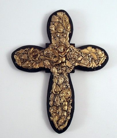 Friends Cross-Cupid Prop - "Friends" (1995-2004) is considered one of the most successful sit-coms of all time, what with ten smash seasons, and actors who made over a million dollars a show! This is an unusual wood cross filled with a faux-gold cupid design used on the series. (Approx. 9" x 7").