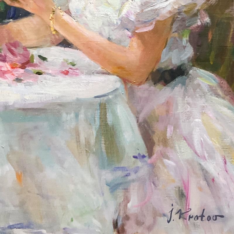 "Friends and Roses" is an original oil painting on canvas by Youri Krotov, hand signed by the artist. This piece comes framed. Includes Letter of Authenticity. Measures approx. 39.5" x 33.5" (frame), 29" x 23" (image). There is some wear on the frame.