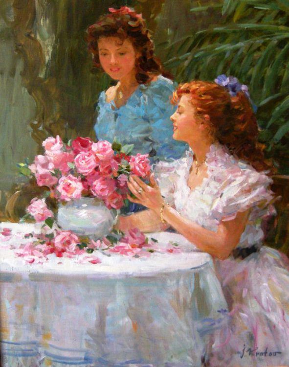 Friends and Roses by Youri Krotov is a framed original oil on canvas with two women and a bouquet of pink roses. The size is 40" x 34".