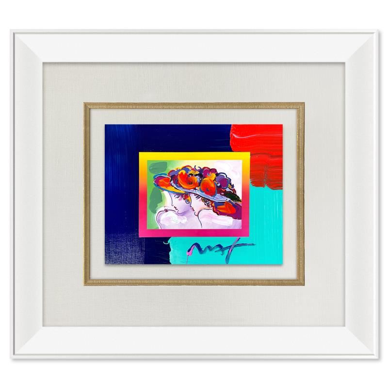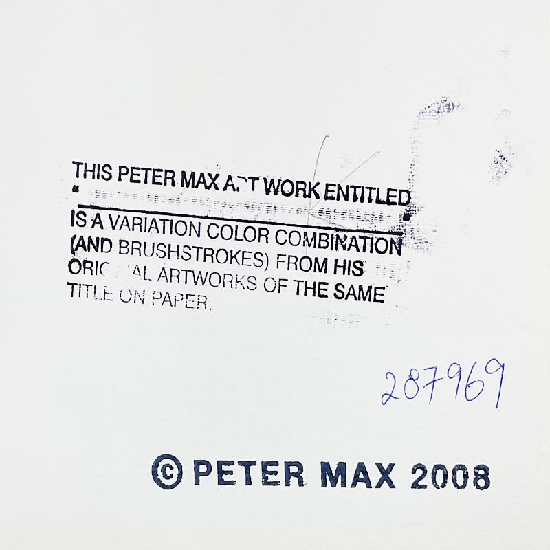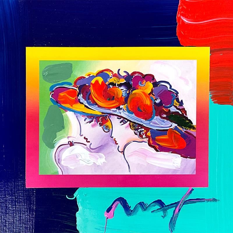 "Friends" is a one-of-a-kind acrylic mixed media on paper, hand signed by Peter Max. The piece comes custom framed with a backside cutout to display Peter Max Studio registration number 287969 certifying authenticity. Measures approx. 23" x 26" (frame), 10" x 13" (image). This item requires special handling and may have a longer than usual turnaround.