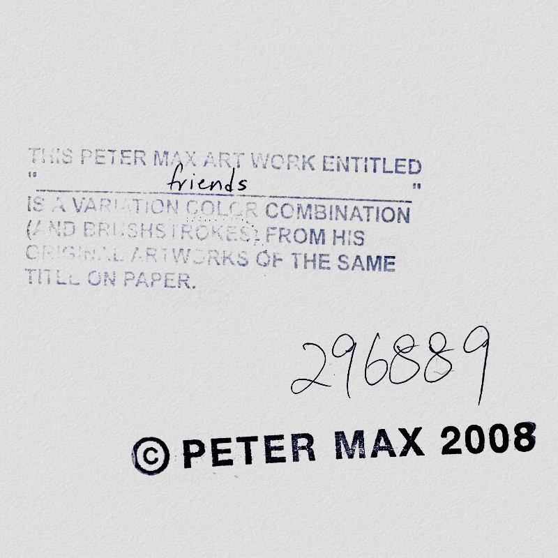 "Friends" is a one-of-a-kind mixed media on paper, hand signed by Peter Max. The piece comes custom framed with a backside cutout to display Peter Max Studio registration number 296889 certifying authenticity. Measures approximately 36" x 48" (frame), 24" x 36" (image). This item requires special handling and may have a longer than usual turnaround.