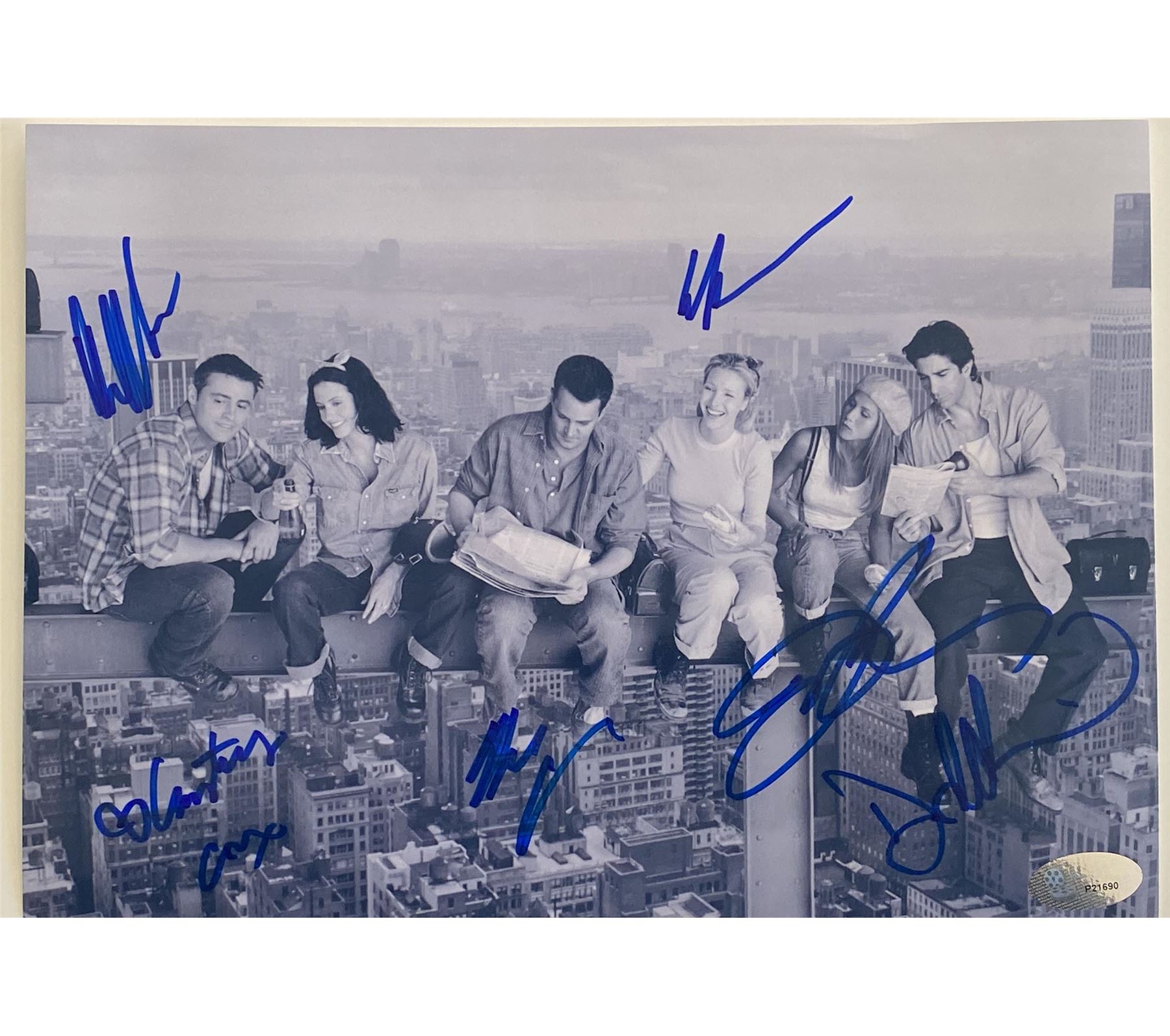 Friends cast signed photo autographed by Matt LeBlanc, Courteney Cox, Matthew Perry, Lisa Kudrow, Jennifer Aniston and David Schwimmer. 12x9 inches.Reel Hollywood authenticated