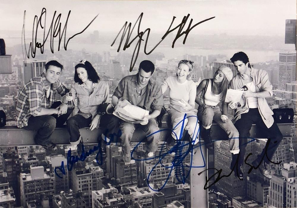 Friends cast signed photo autographed by Matt LeBlanc, Courtney Cox, Matthew Perry, Jennifer Aniston, and David Schwimmer. 8x10 inches.