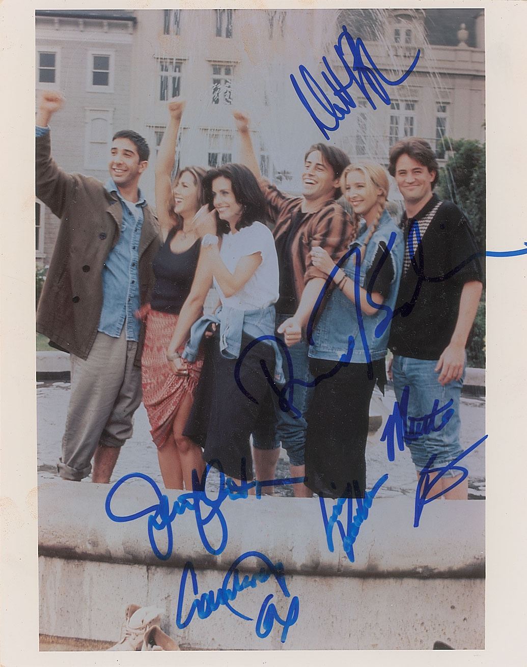 Color glossy 8 x 10 photo of the cast of Friends, signed in blue felt tip by Jennifer Aniston, Courteney Cox, Matt LeBlanc, Matthew Perry, Lisa Kudrow, and David Schwimmer. In fine condition.