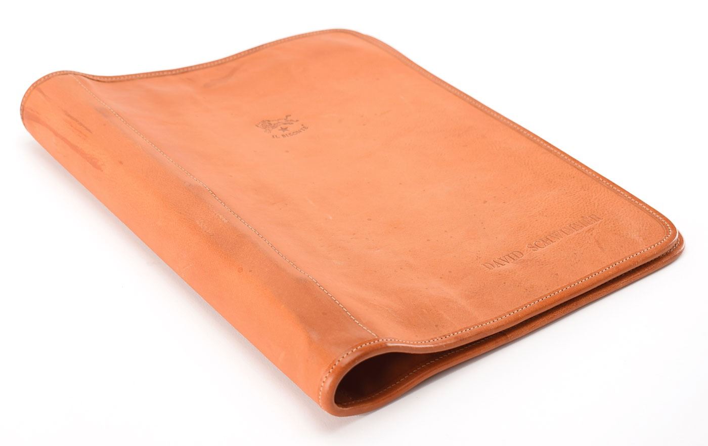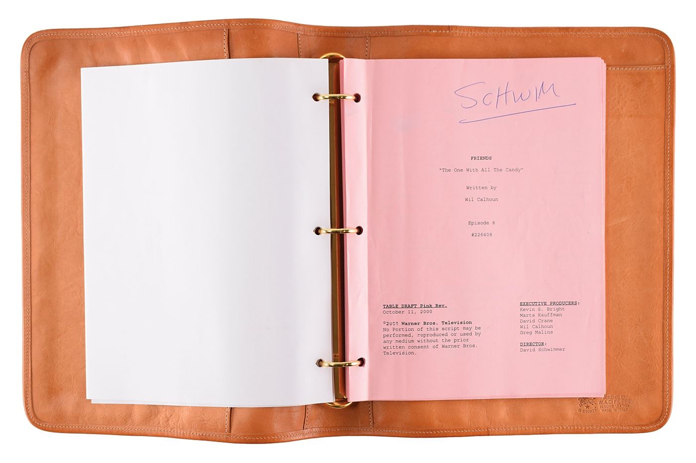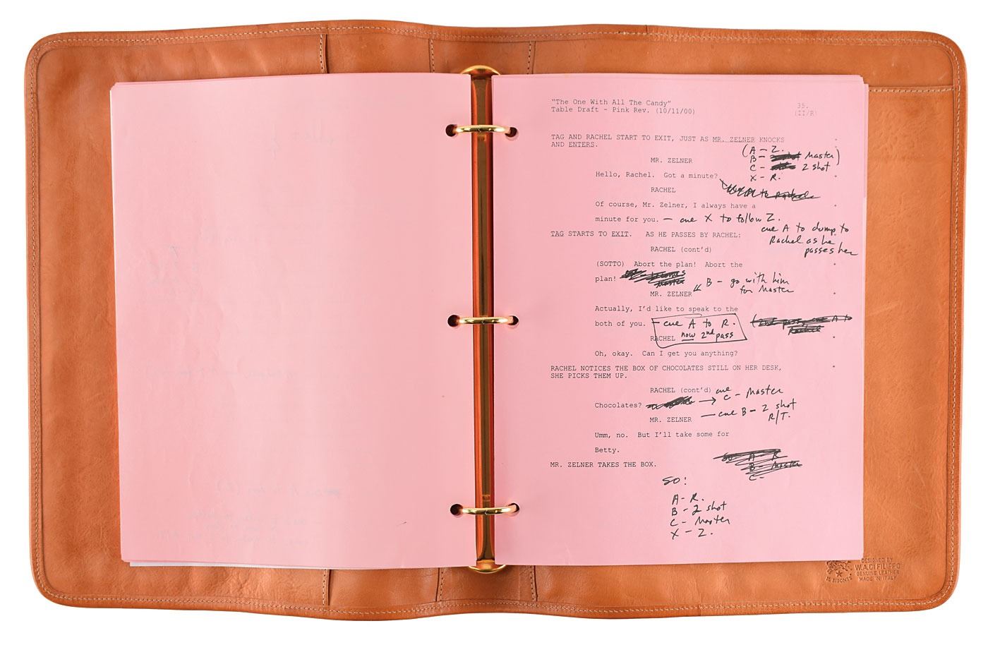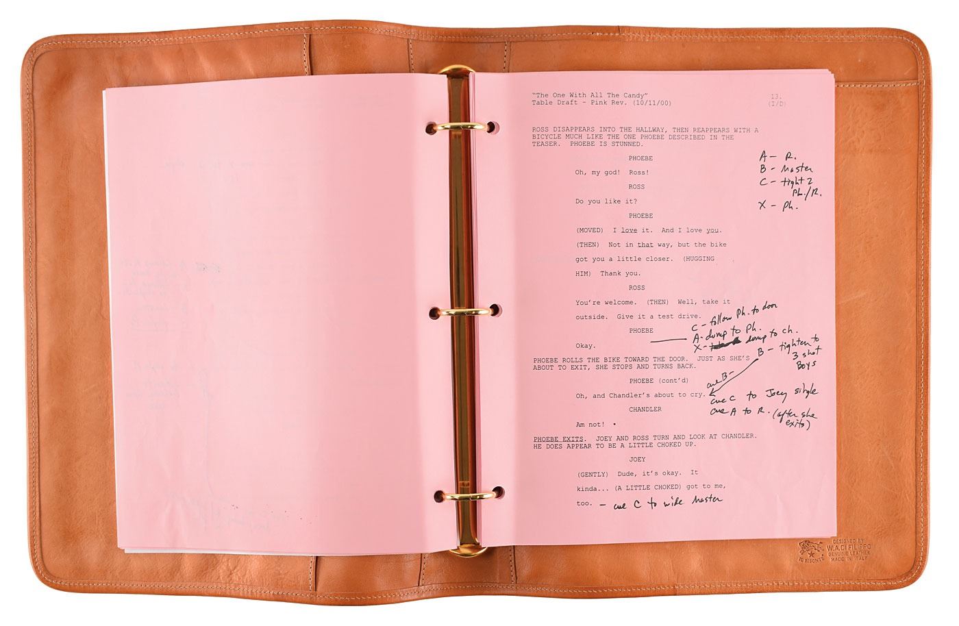 Original table draft script for the Friends episode 'The One with all the Candy,' season 7, episode 8, dated October 11, 2000, 44 pages, 8.5 x 11, with title page annotated in blue ballpoint, "Schwim," indicating that this copy belonged to actor David Schwimmer, who also directed the episode. The entirety of the script features copious handwritten notes in pencil and ink, with the majority related to camera and stage directions. Housed in its original Il Bisonte leather binder with lower right impressed with Schwimmer's name. In fine condition. Schwimmer directed a total of 10 episodes of Friends during the show's hugely popular run of 10 seasons, with this particular episode—revolving around Monica's candy, Phoebe's new bike, and Rachel's workplace romance—ultimately airing as the ninth episode on December 7, 2000.