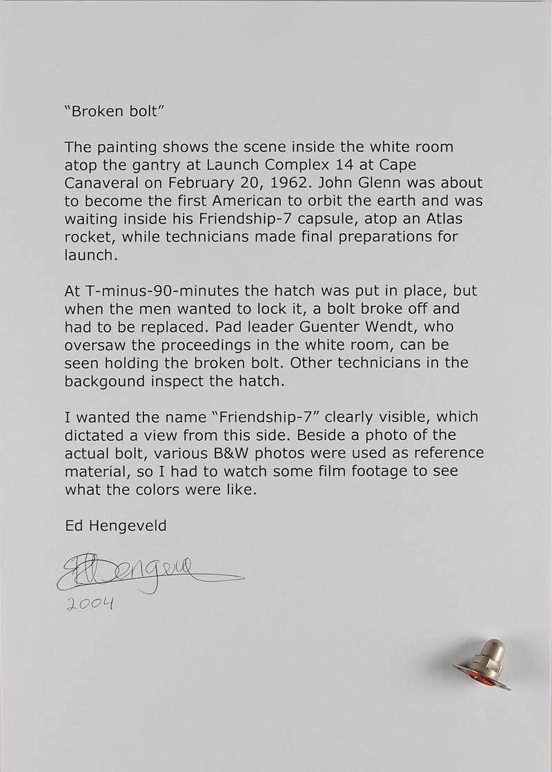Famous, or infamous, broken hatch bolt from John Glenn’s Friendship 7 mission. This partial bolt and platenut were used to seal the hatch of the capsule, was broken during the final torque application, and replaced by McDonnell technicians under Guenter Wendt’s supervision, causing a 22 minute delay in the launch. Accompanied by a detailed letter of provenance from Wendt, which reads, in part: “There are many stories circulating about who has the actual bolt that broke off during the hatch installation of John Glenn’s capsule…After the astronaut had entered the capsule I got the permission from the test conductor to install the explosive hatch…After the cabin hatch was in place one of the pre-drilled attachment bolts broke during the final torque application. I informed the test conductor and he requested a ‘hold’ in the launch count. A conference was held in the control center and I was told to open the hatch and replace the bolt with a new platenut. After a 22-minute delay the platenut was replaced and the hatch reinstalled…After the successful launch John Yardley informed me that Mr. ‘MAC’ [president of the McDonnell Corporation wanted the broken bolt for permanent display…and I should deliver the bolt to him. When I handed the bolt to him he looked at me and remarked ‘There is only one guy who knows if this is the REAL bolt’ For tens of years I was asked, who has the real bolt. The truth actually slipped out when I was interviewed by Walter Cronkite on CNN…I showed the real bolt and the platenut with the broken off piece of bolt still in it.” Also accompanied by an original 15.5 x 12 color painting of the incident, done by Ed Hengeveld, depicting the launch pad with Wendt holding a bolt, signed in black felt tip, “Guenter F. Wendt, Padleader.” This broken bolt caused the last of several delays of Glenn’s flight. A one-of-a-kind actual piece from the Friendship 7 capsule with direct provenance from the Padleader himself.