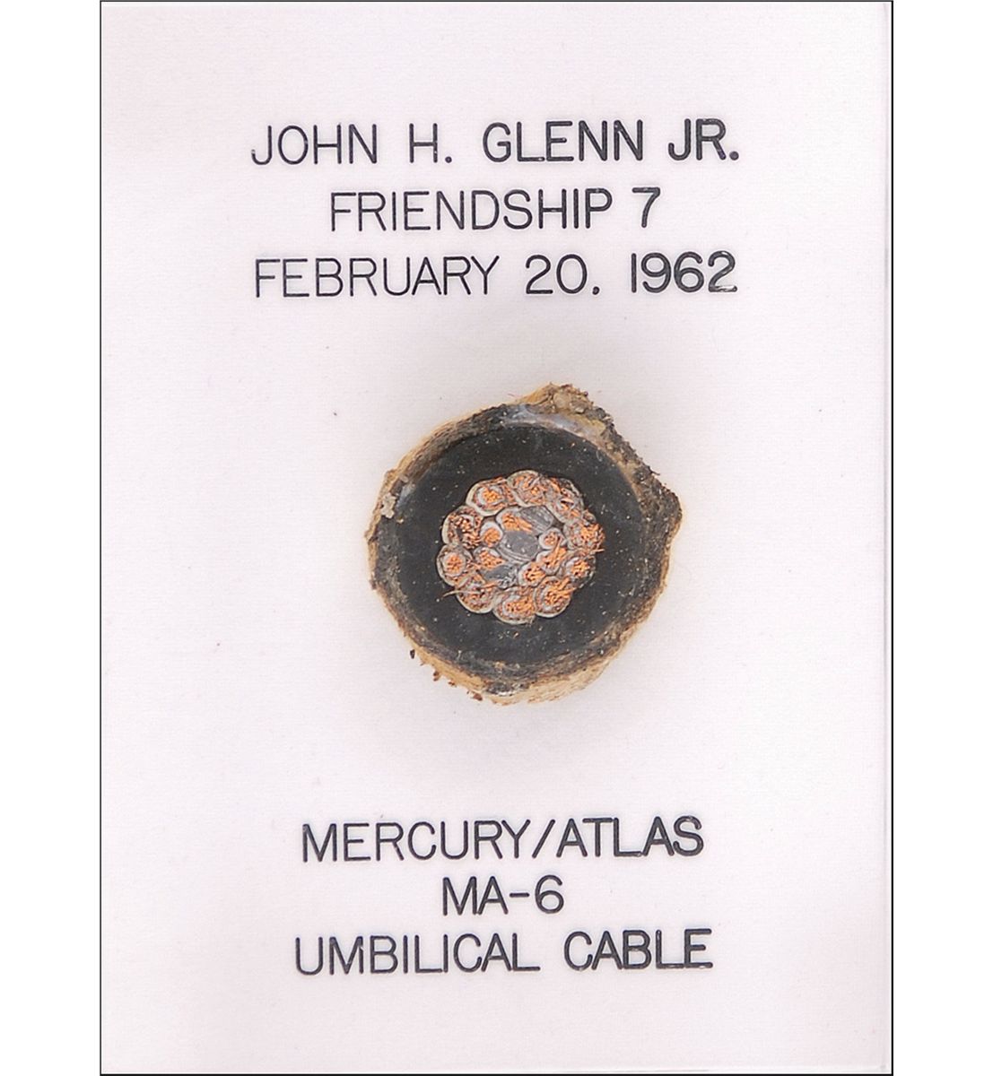 A cut cross section of the last umbilical cable to be released from the Atlas rocket used to launch John Glenn into orbit. The section measures approximately .75? in diameter, and was separated a fraction of a second after lift-off on February 20, 1962. Section is encased in Lucite and accompanied by a photocopied letter of authenticity from Philip Culbertson, stating the cable comes from the final umbilical. Culbertson was the Chief Project Engineer for the Atlas launch vehicles used in the Mercury program.