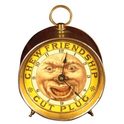 Advertising alarm clock. Chew Friendship Cut Plug Tobacco. Excellent working condition. 4 inch diameter face X 4 inches tall X 2 1/2 inches deep.