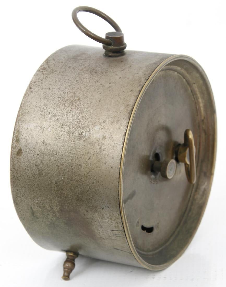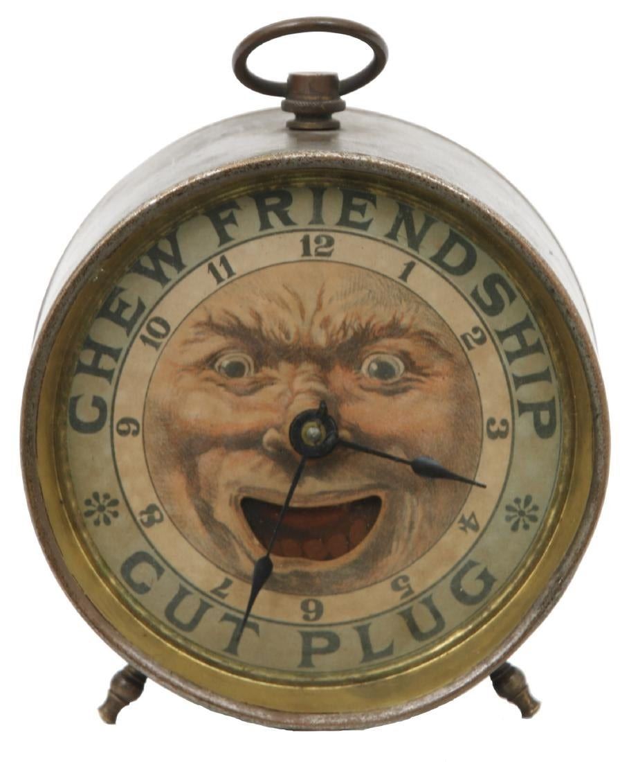 Friendship Plug Animated Advertising Clock. 3.5 in. paper dial with face in the center, black hour numbers and tobacco advertising text outside reads "Chew Friendship Cut Plug", has a cutout in the mouth exposing the jaw which animates up and down with the beat of the escapement. Brass spring driven movement is in good working condition, with flat dial glass, 4 in. dia. Weight: 1 lbs.
