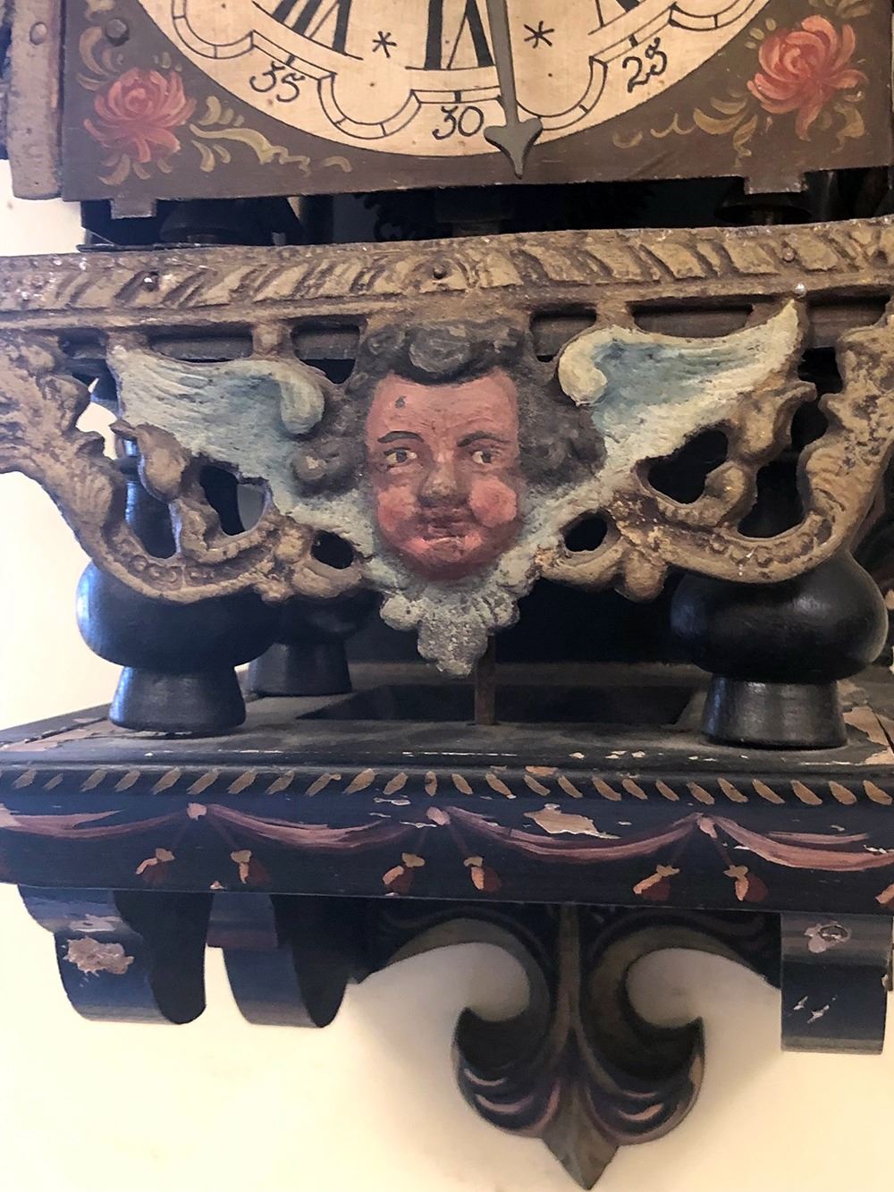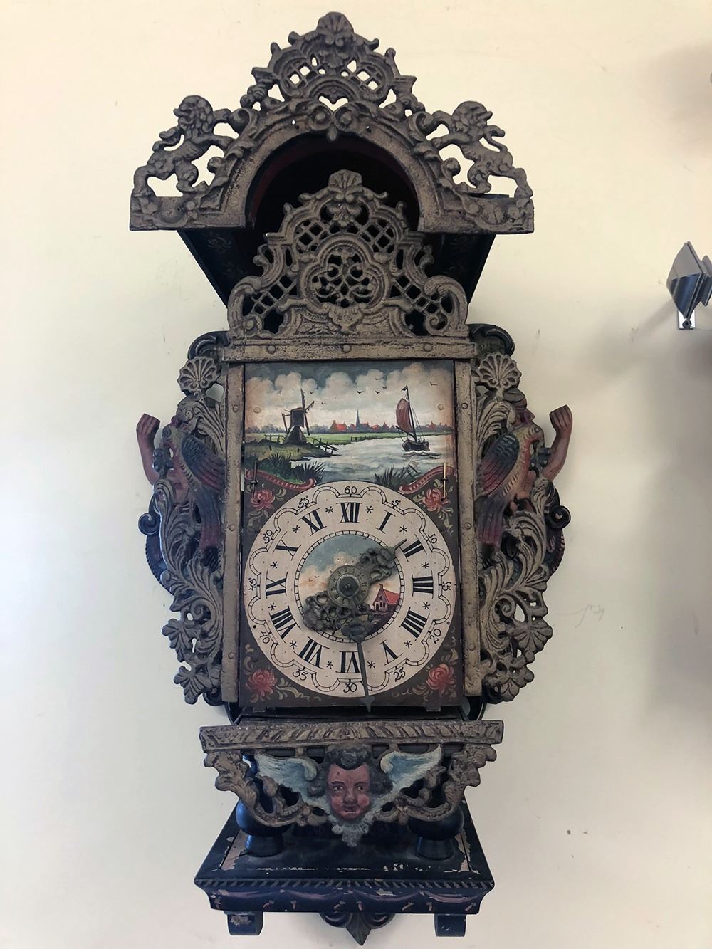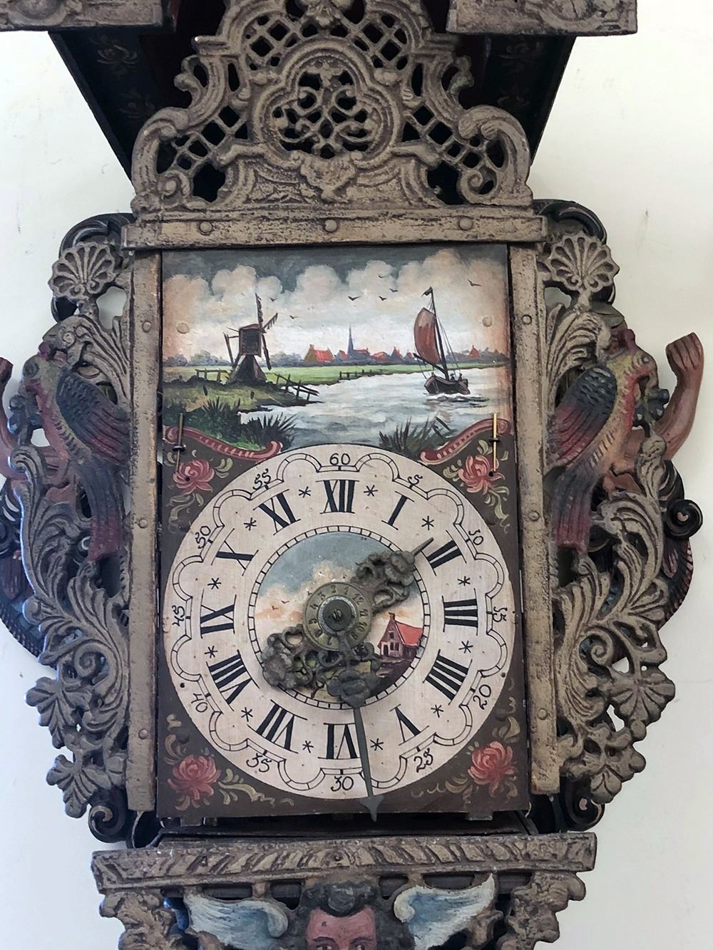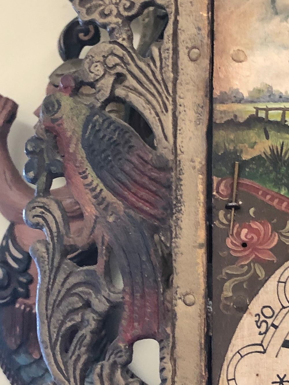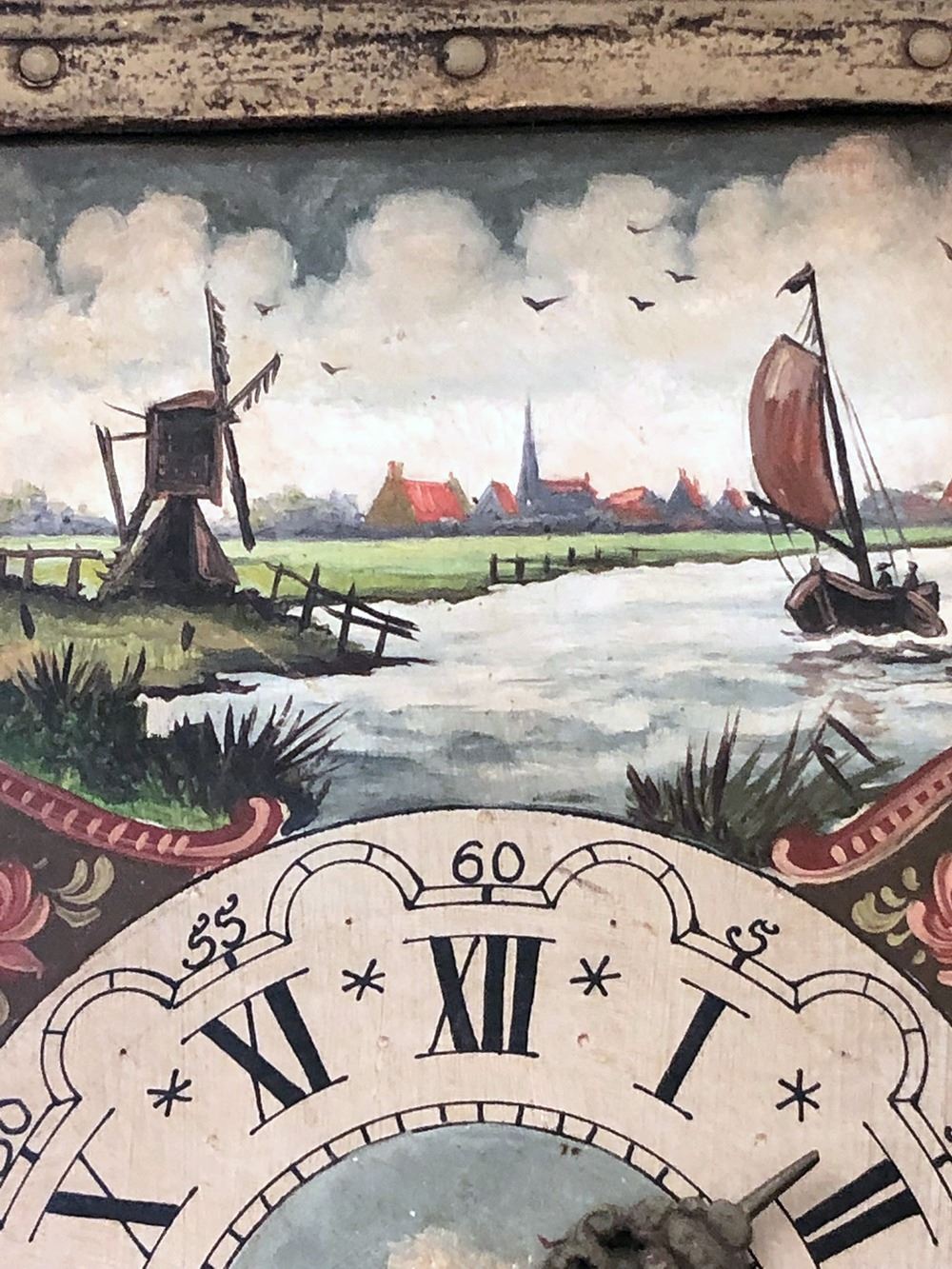 Antique 19th Century Dutch Friesland Wall Clock with Mermaids, rare Friesland panted. Measures approx. 26.5 in. tall. Exceptional clock, parrots and mermaids on both sides, angel/cherub at bottom, windmill, sailing ships, Dutch scene painted on face, very ornate.