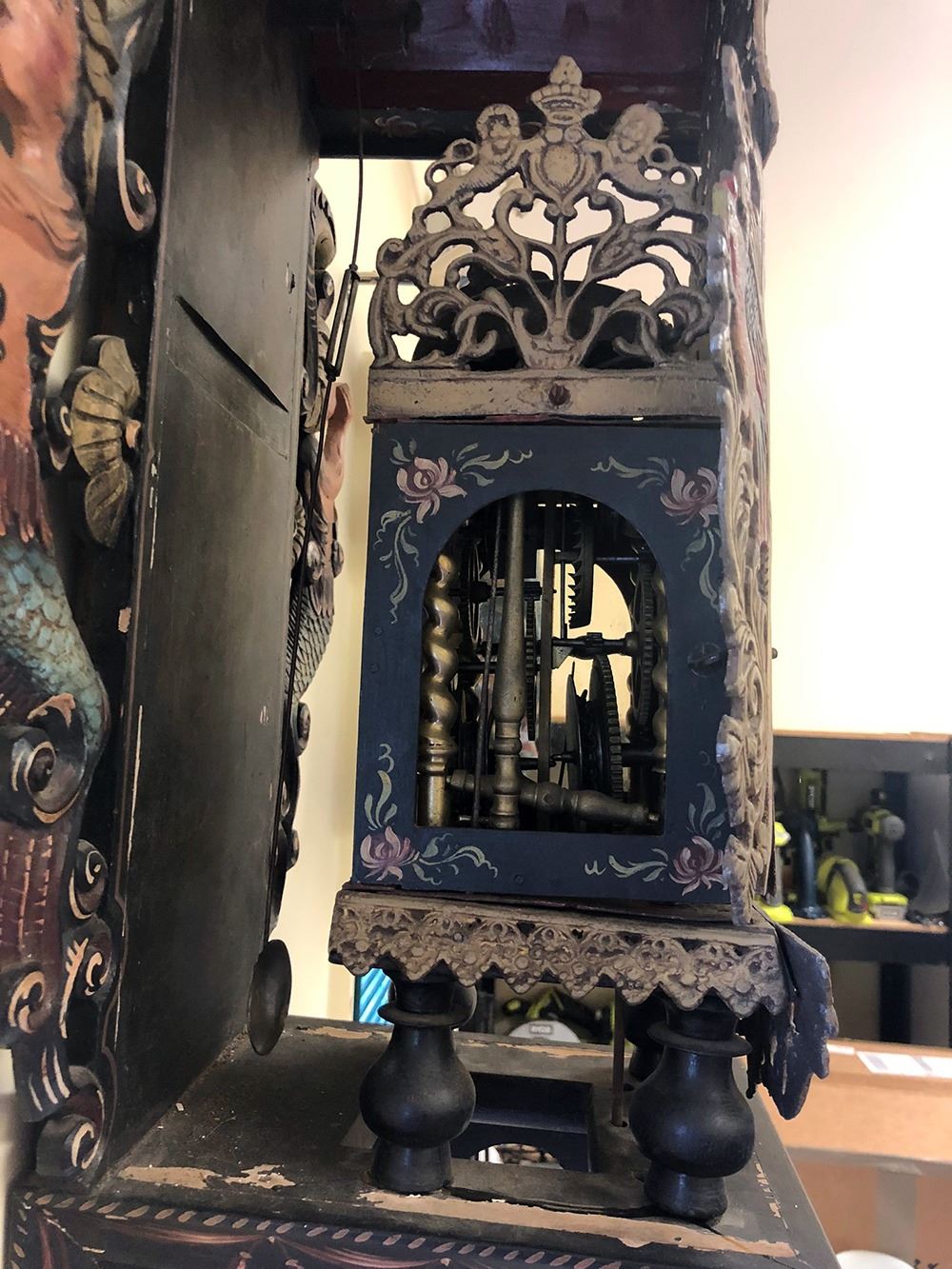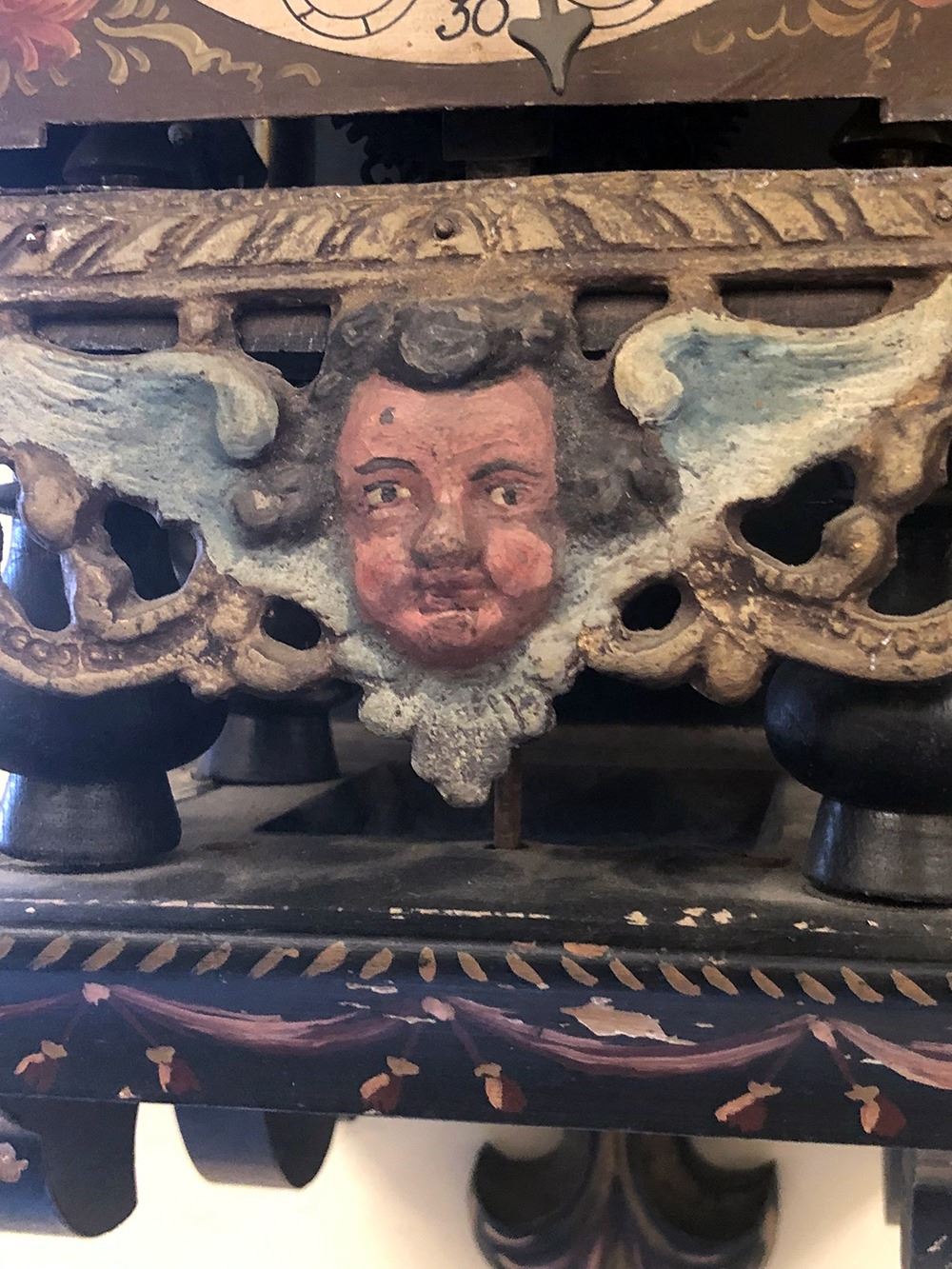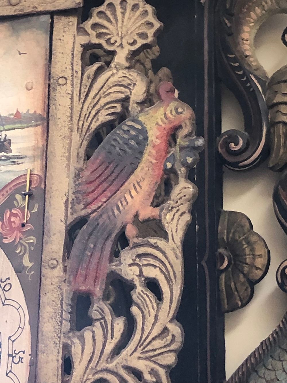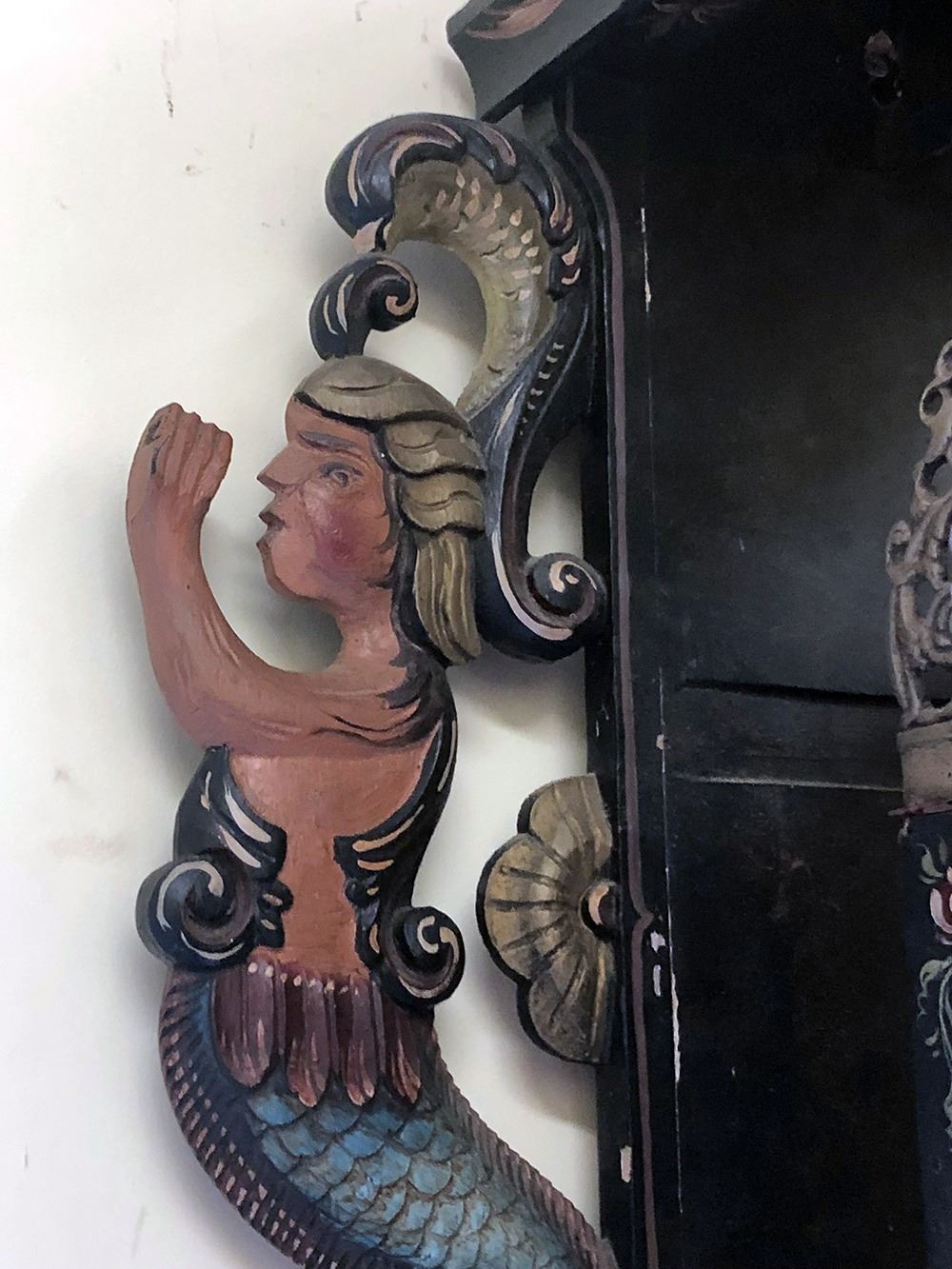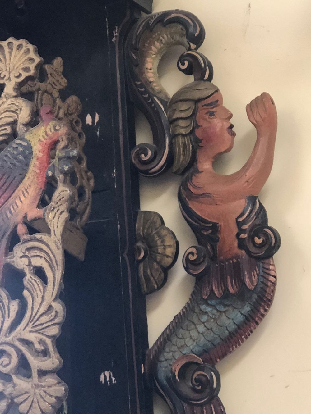 Antique 19th Century Dutch Friesland Wall Clock with Mermaids, rare Friesland panted. Measures approx. 26.5 in. tall. Exceptional clock, parrots and mermaids on both sides, angel/cherub at bottom, windmill, sailing ships, Dutch scene painted on face, very ornate.