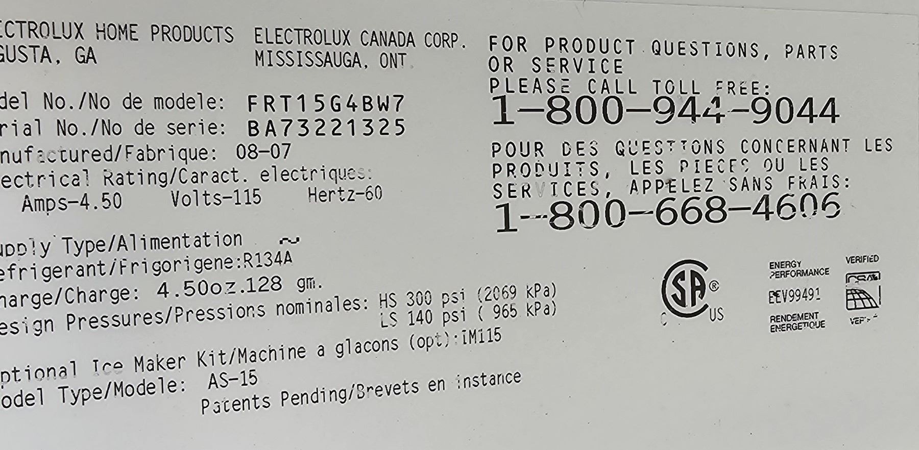 Frigidaire Fridge/Freezer Model# FRT15G4BW7 - Untested