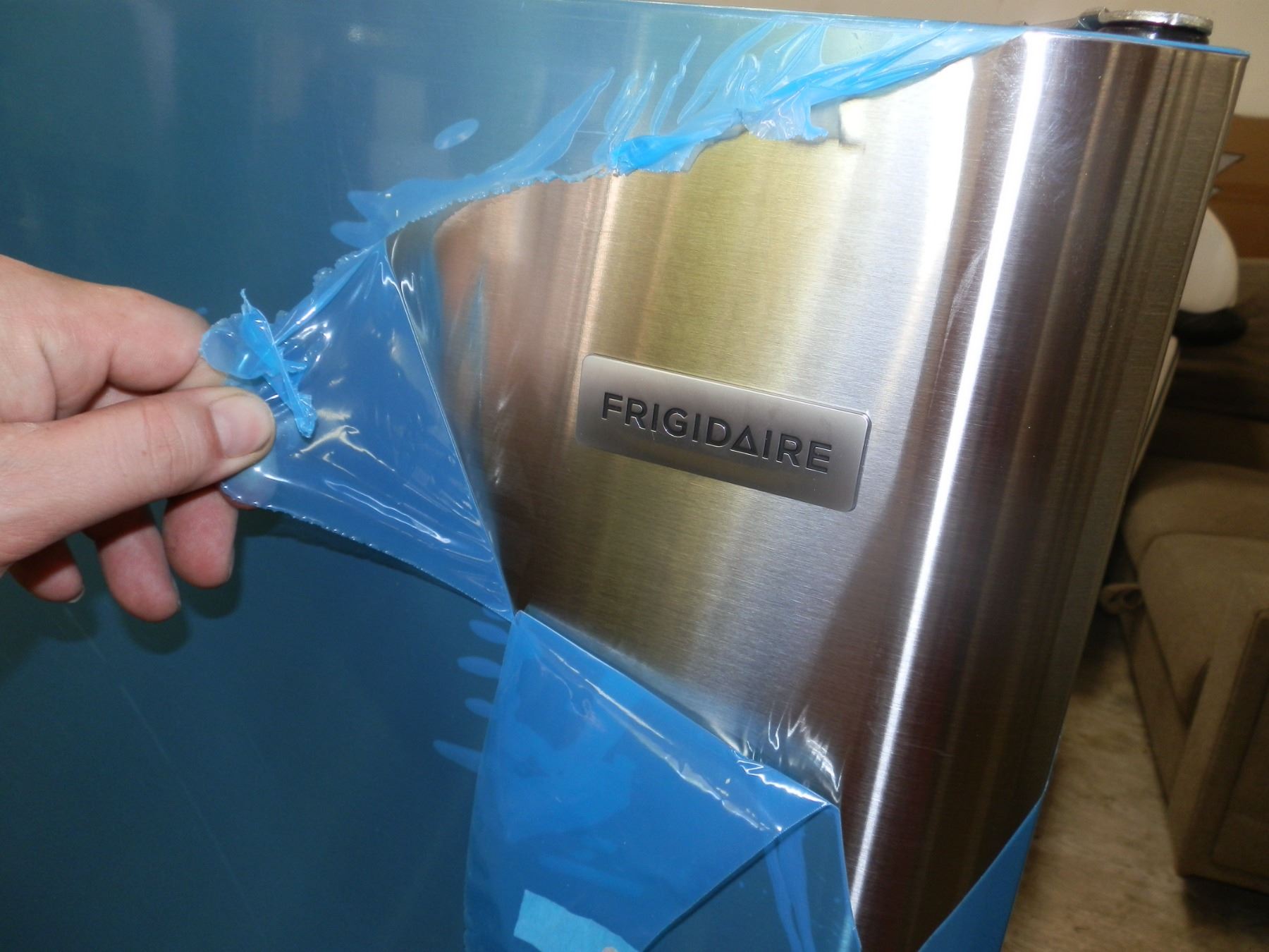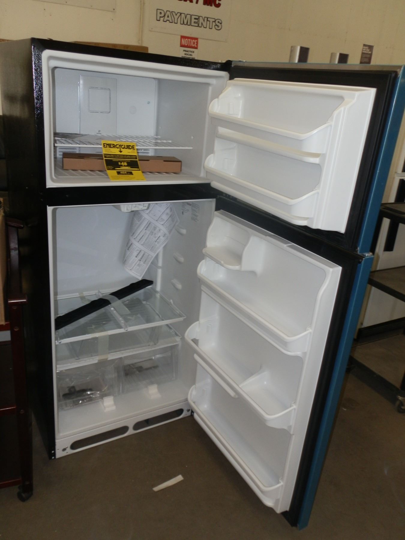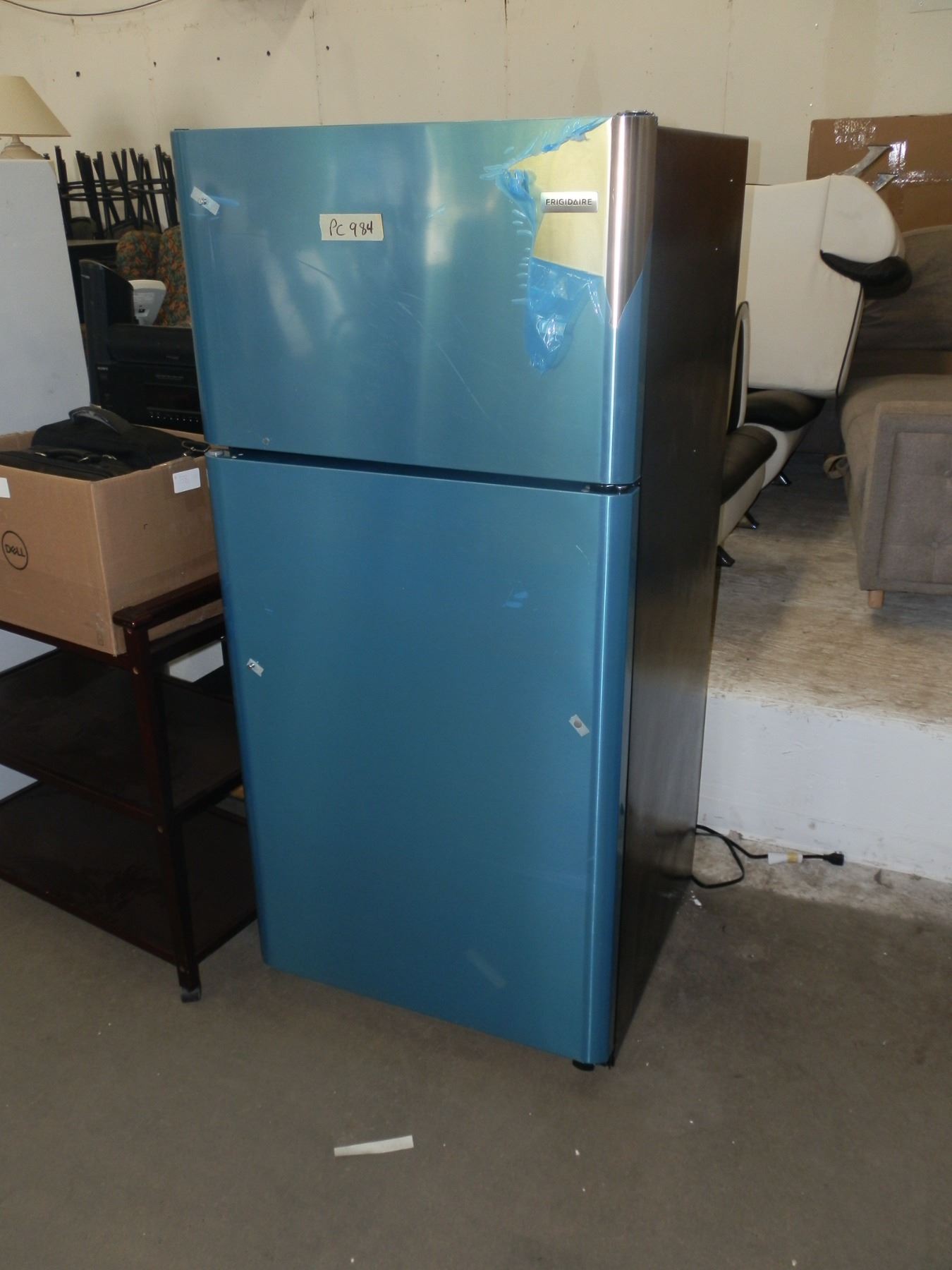 Frigidaire Fridge, black and stainless as seen in the photos...the blue protective plastic is still on the doors as seen in the photos...the power cord has been fix... The fridge is in New Condition....