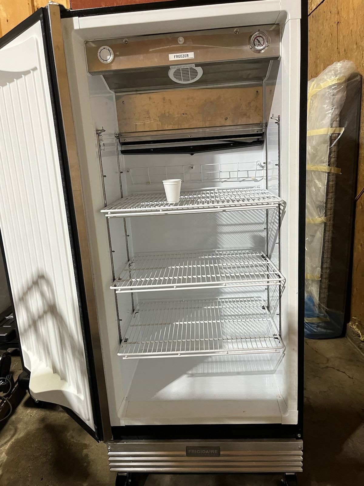 Frigidaire Stand Up Deep Freeze On Wheels, 36"l 32 1/2"d 75"h, doesn't get cold, might need a freon charge...used