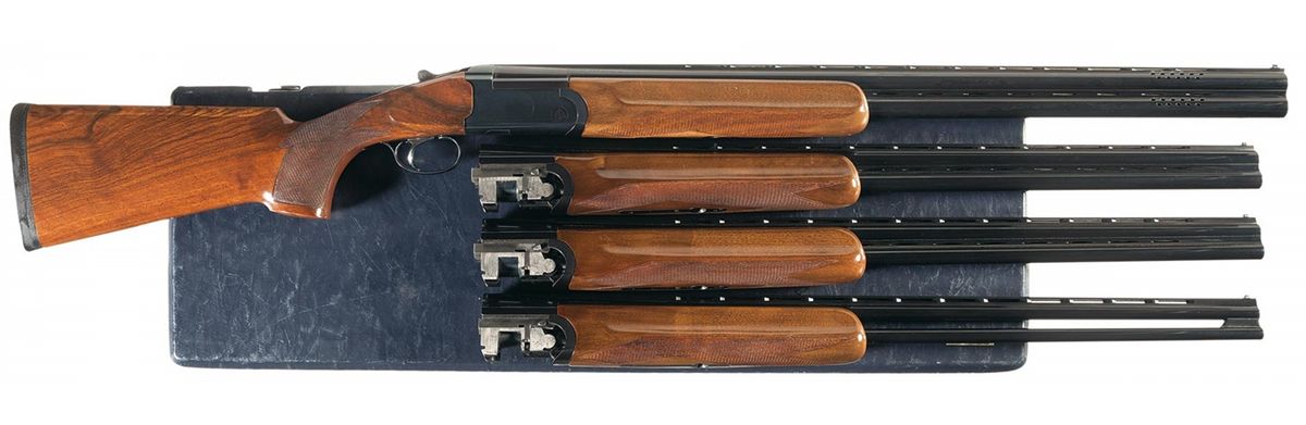 Introduced in 1986. White bead front and steel mid bead on a vent rib, ported 12 gauge barrels. Single trigger with a tang mounted safety. Choke tube system with skeet/skeet installed and 3 inch chambers with ejectors. Mounted on a checkered walnut forearm and pistol grip stock with a replacement solid rubber recoil pad. Length of pull is 14 3/8 inches. All extra barrel sets have white bead front and steel mid bead sights on 28 inch vent rib with dedicated walnut checkered forearms. The 20 gauge set chokes improved cylinder/improved cylinder with 3 inch chambers and ejectors. The 28 gauge set chokes improved cylinder/modified with 3 inch chambers and ejectors. The 410 gauge chokes cylinder/cylinder with 3 inch chambers. Complete with 4 extra 12 gauge choke tubes, choke tube wrench, hex wrench, cased small parts and a factory hardcase.